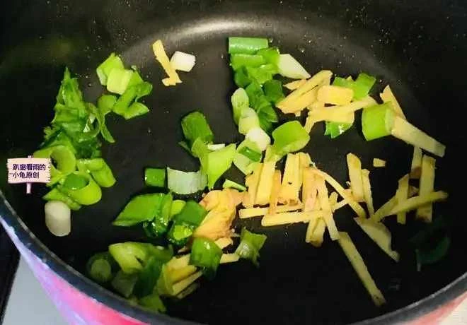 Dùng nồi khác, phi thơm gừng sợi và hành lá với chút dầu ăn.
