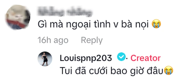 Giữa làn sóng bàn tán, Louis nhanh chóng có động thái phản hồi. Khi một cư dân mạng thắc mắc: “Gì mà ngoại tình vậy Louis?”, cô đáp lại thẳng thắn: “Tôi đã cưới bao giờ đâu”.