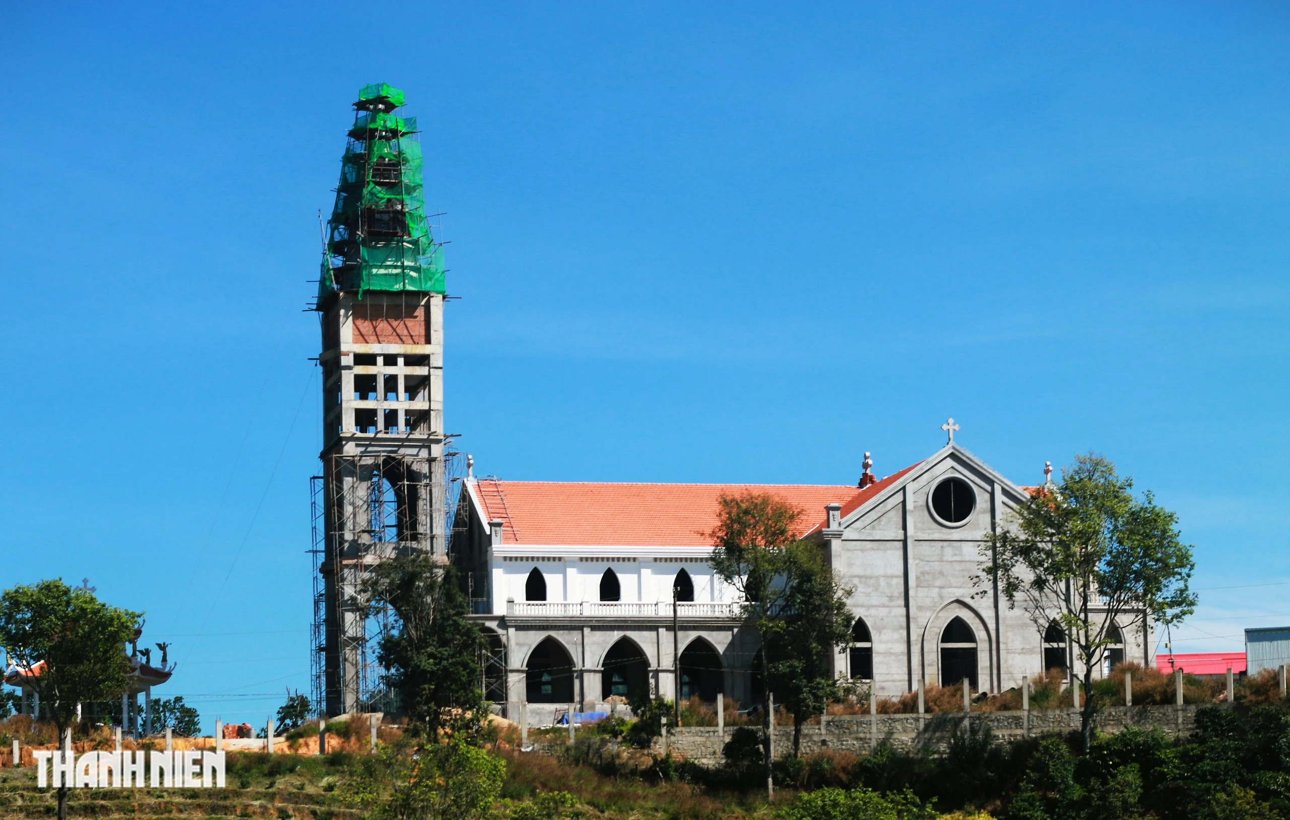 Tháp chuông nhà thờ đang xây dựng trên đồi cao