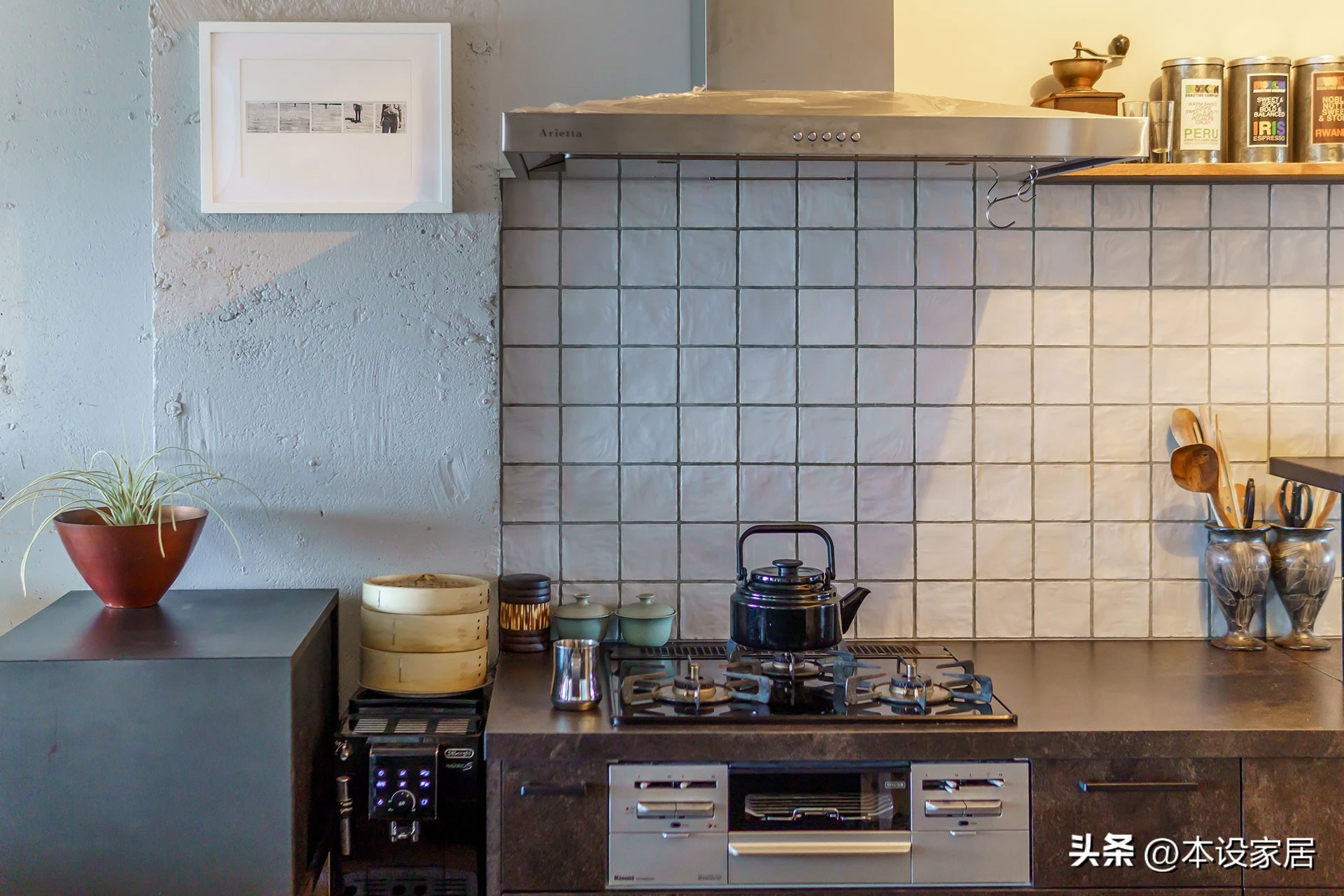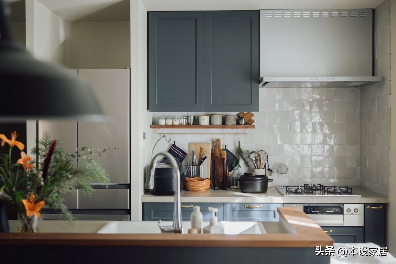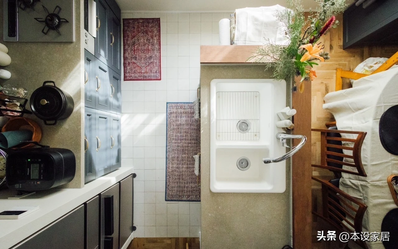 Bếp được thiết kế theo kiểu Type II, có đảo bếp nhỏ, đủ dùng cho một người. Mọi dụng cụ đều treo hoặc cất gọn, không có đồ trùng lặp.