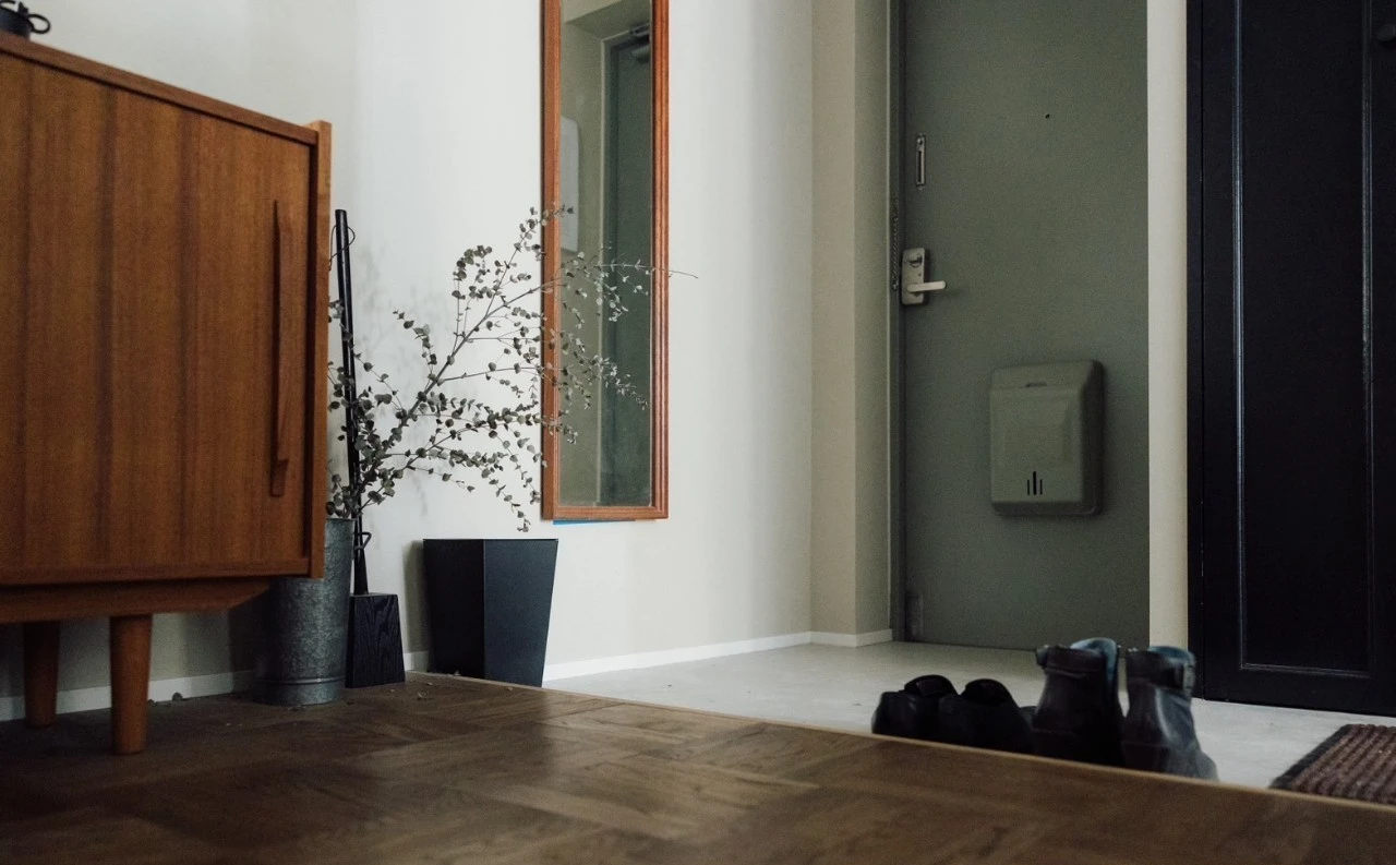 Lối vào kiểu Nhật nhỏ gọn, sàn gạch men trắng ngà, chỉ có đúng hai đôi giày bệt màu đen đặt song song. Không kệ giày chất cao. Không giày “mua cho có”. Một chậu cây xanh nhỏ đặt cạnh cửa – vừa đủ để tạo cảm giác trở về nhà, không phát sinh thêm chi phí chăm sóc rườm rà.