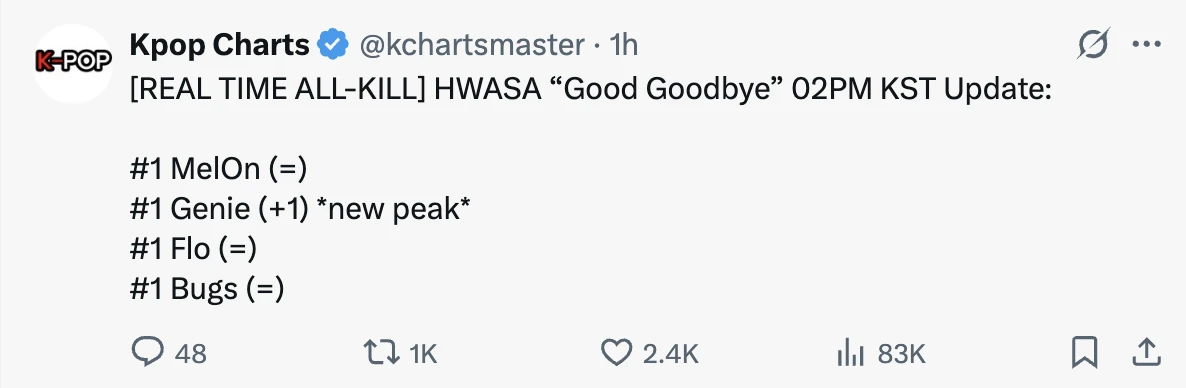 Sau 3 ngày kể từ khi kết thúc lễ trao giải, tính đến 13h chiều ngày 22/11 (theo giờ Việt Nam), Good Goodbye đã “phi tên lửa” leo lên top 1 tất cả BXH nhạc số Hàn Quốc, phủ xanh toàn chart nội địa, được kỳ vọng sẽ sớm đạt được PAK trong thời gian tới.