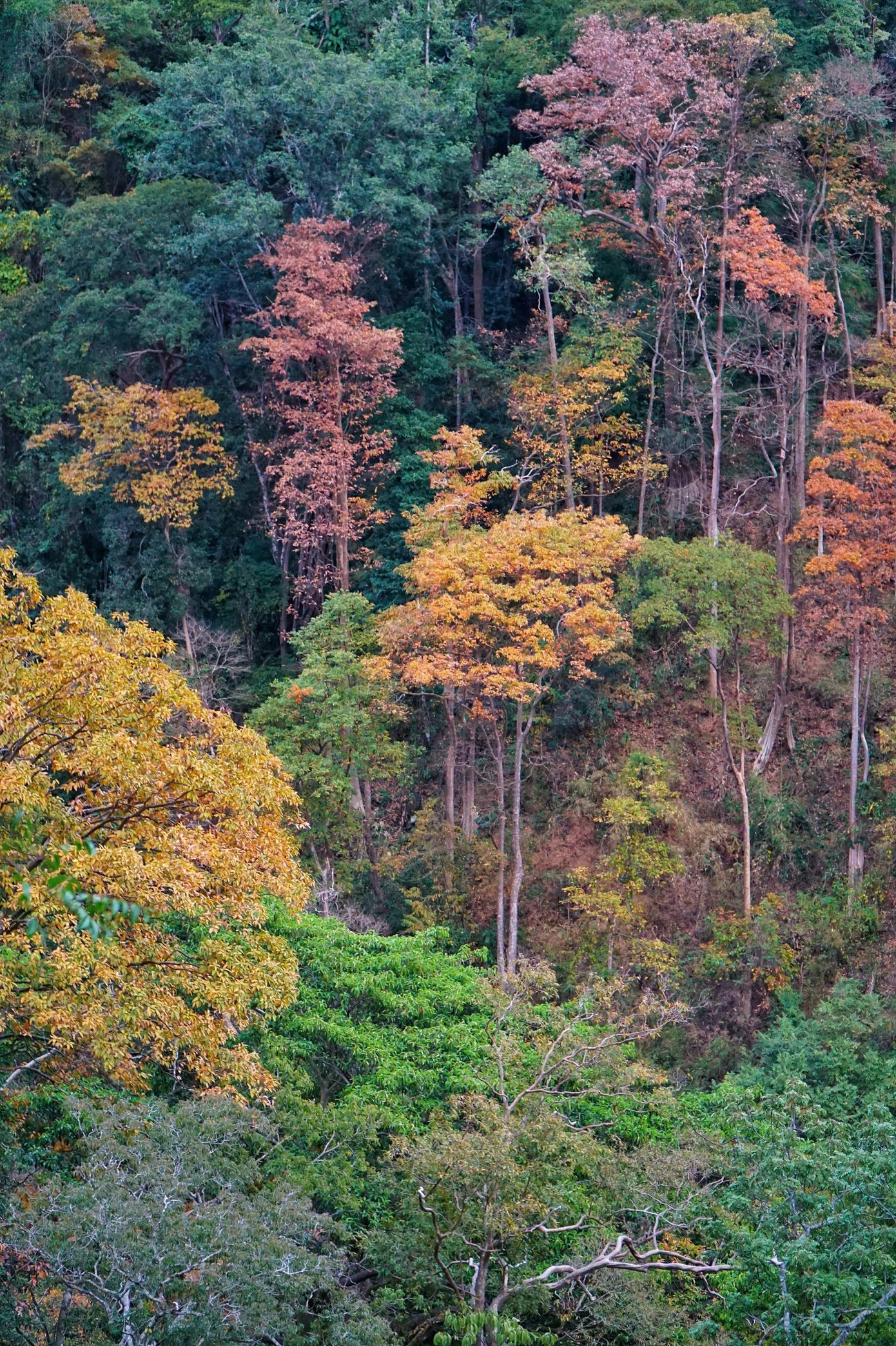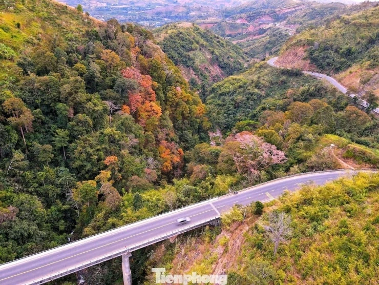 Khác với vẻ trầm mặc thường thấy, mùa này du khách đi ngang cung đèo thường chủ động giảm tốc độ để chiêm ngưỡng thảm thực vật đang chuyển mình. Những tán lá non và lá già xen kẽ, chưa kịp rụng hết đã đổi màu, tạo nên những mảng màu chồng lớp độc đáo, không cây nào giống cây nào.