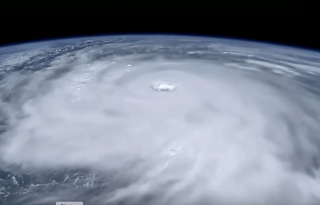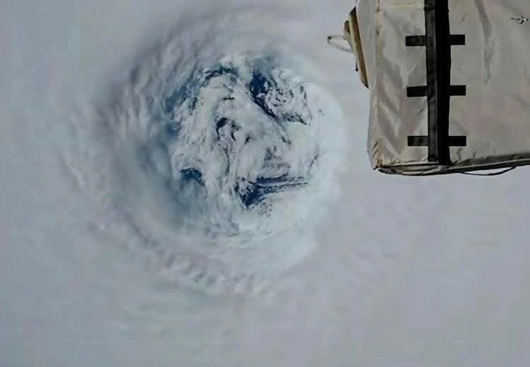 Bức ảnh cho thấy mắt bão khổng lồ và luồng hoàn lưu hẹp giống như một xoáy nước màu trắng bạc, với các bức tường mây dày đặc trông như một con quái vật khổng lồ nhìn từ trên cao.