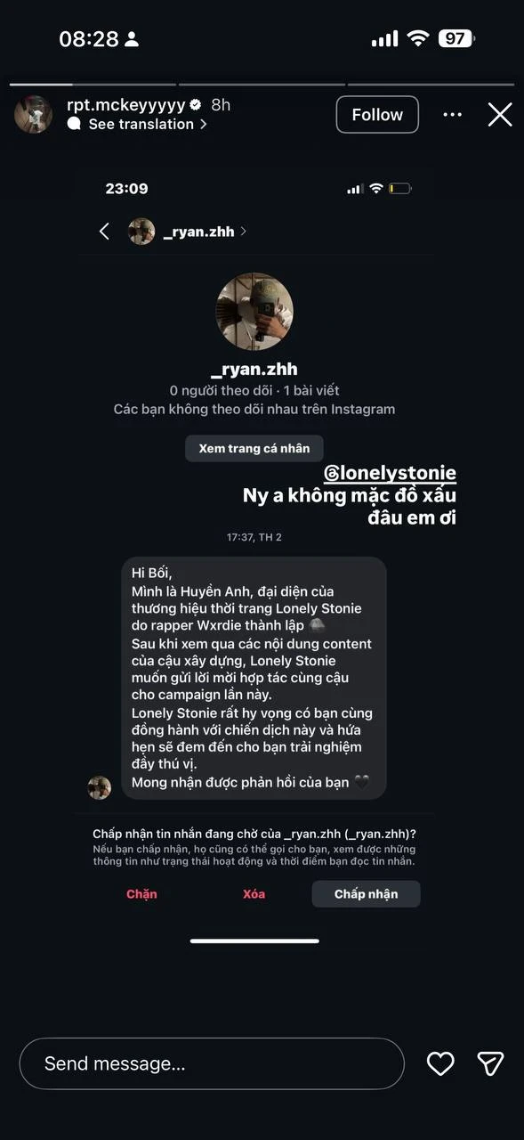 MCK và Wxrdie đang là 2 cái tên gây bàn tán khắp mạng xã hội . Nguồn cơn khiến họ được chú ý đến từ chiếc story “var cực mạnh” của MCK hướng đến Wxrdie. Theo đó, MCK đã đăng tải ảnh chụp ảnh hình tin nhắn đại diện thương hiệu thời trang do Wxrdie thành lập ngỏ ý mời bạn gái của nam rapper này hợp tác cho chiến dịch quảng cáo mới. Lời mời được phía brand của Wxrdie gửi đi vào ngày 20/10. Người yêu của MCK vẫn chưa phản hồi.