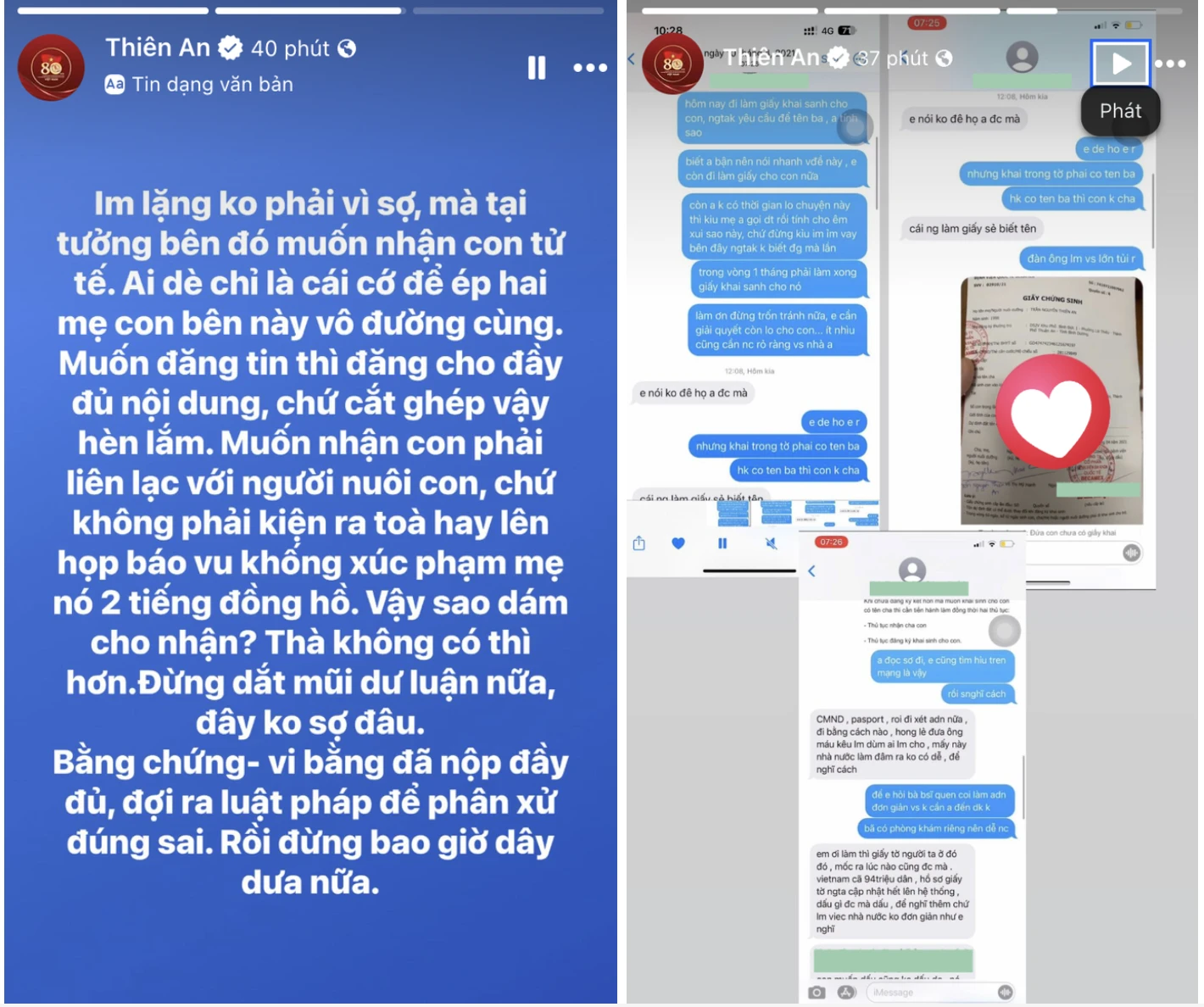 Mới đây nhất, Thiên An lên tiếng: “Từ chối làm khai sinh vì sợ ‘94 triệu dân biết’. Rồi giờ gây áp lực để xét ADN? Chưa có tên trong khai sinh đã vậy? Có tên rồi chắc cướp con tui luôn. Đời tui coi như bỏ. Nhưng đừng hòng đụng tới con tui”.
