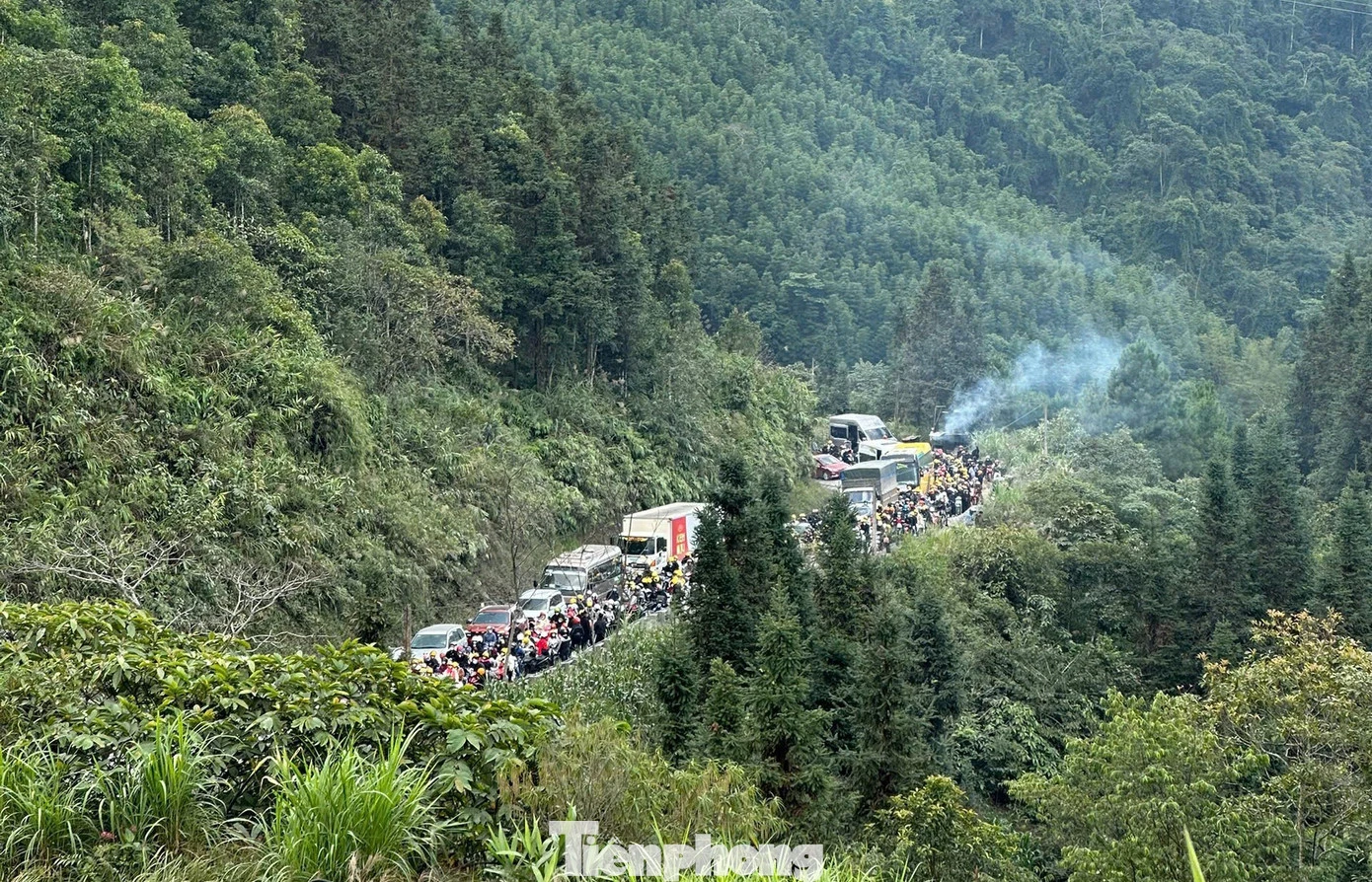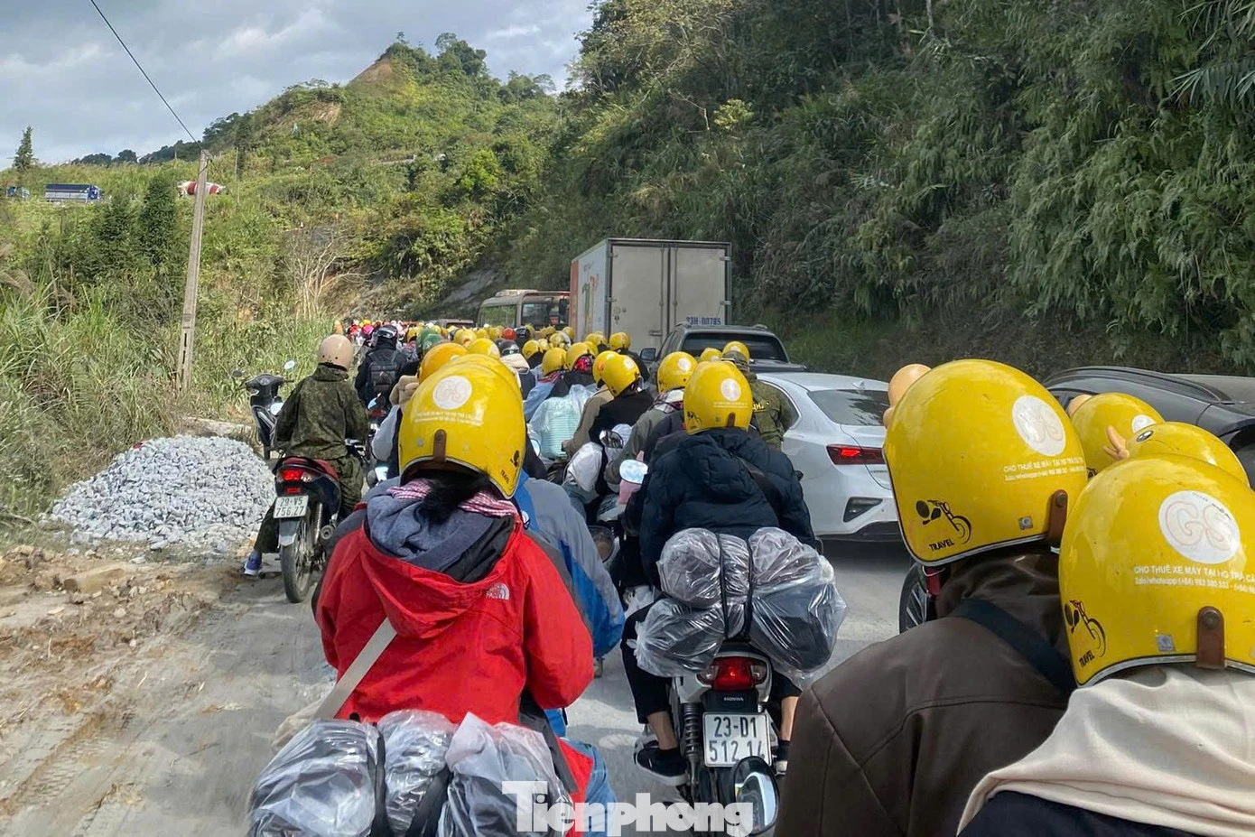 Dòng phương tiện chen nhau nhích từng chút một. Các khúc cua hẹp vốn đã khó di chuyển nay càng chật chội khi lượng xe con, xe du lịch 29-45 chỗ, xe tải nhỏ dồn về cùng lúc. Không ít người đi phượt bằng xe máy phải xuống dắt bộ, len lỏi qua khoảng trống hẹp giữa hai làn xe.