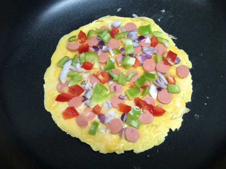 Khi trứng chưa đông, xếp xúc xích và rau củ lên trên.