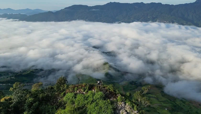 Nhờ địa hình đặc thù, vào sáng sớm, các khối mây thường tích tụ dày đặc và trôi lững lờ dưới chân núi. Hiện tượng này tạo nên một “biển mây” trắng xóa bồng bềnh, khiến nhiều người không khỏi ngỡ ngàng trước vẻ đẹp hoang sơ của thiên nhiên.