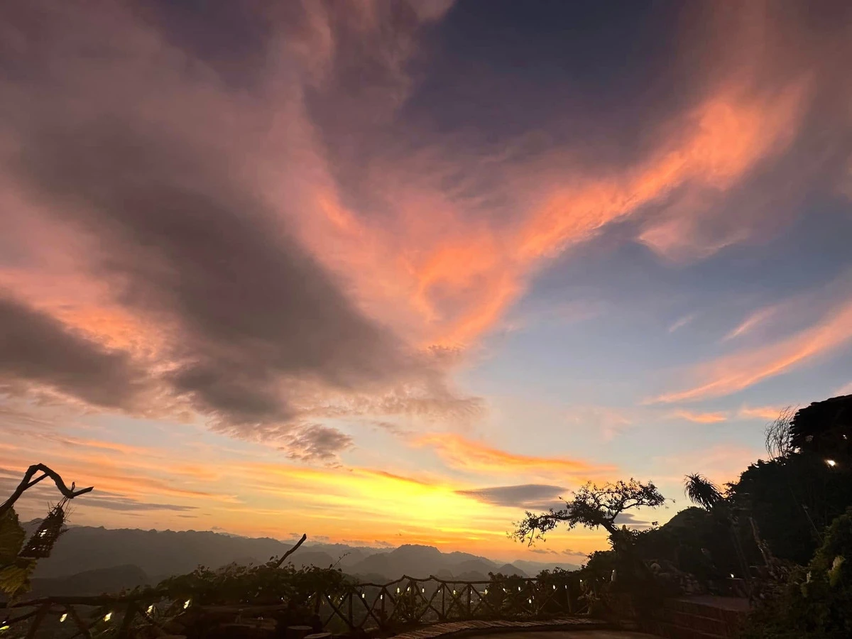 Không chỉ hấp dẫn vào buổi sớm, đỉnh Mu Náu còn là điểm ngắm hoàng hôn được nhiều du khách yêu thích. Từ khoảng 16h30, khi mặt trời dần khuất sau các dãy núi, bầu trời chuyển sang những gam màu cam, hồng, tím rực rỡ, phản chiếu lên mây và rừng núi tạo nên khung cảnh đầy cảm xúc. Ảnh Tiệm cà phê Mu Náu Ơi