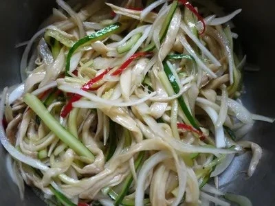 Nấm đùi gà có thể được thái lát bằng dao hoặc xé thành sợi bằng tay. Nhớ chần kỹ trước khi làm món ăn. Ớt chuông xanh cũng có thể được chần sơ rồi trộn, hoặc bạn có thể trộn chúng với dầu nóng trước để làm nổi bật hương thơm.