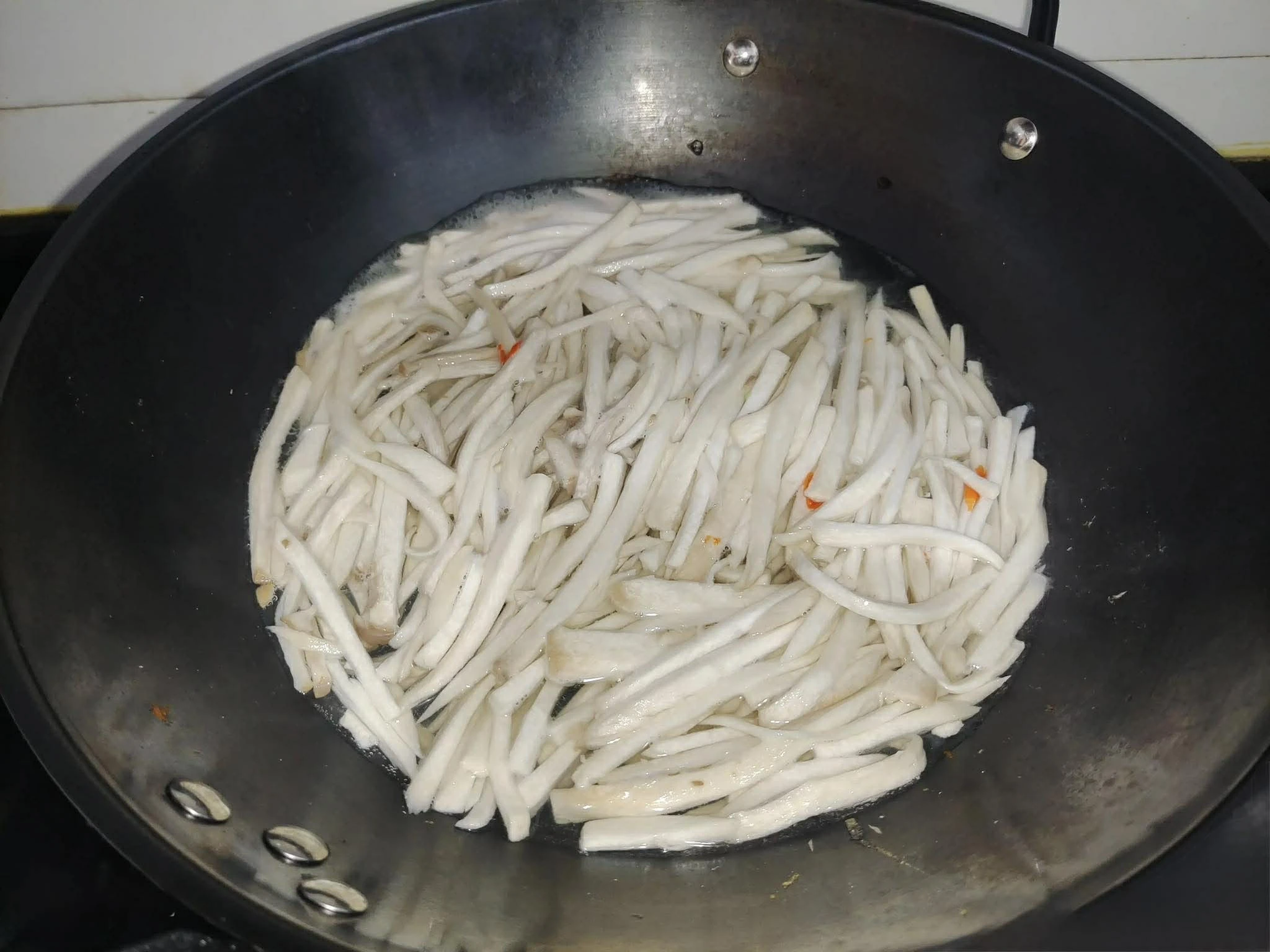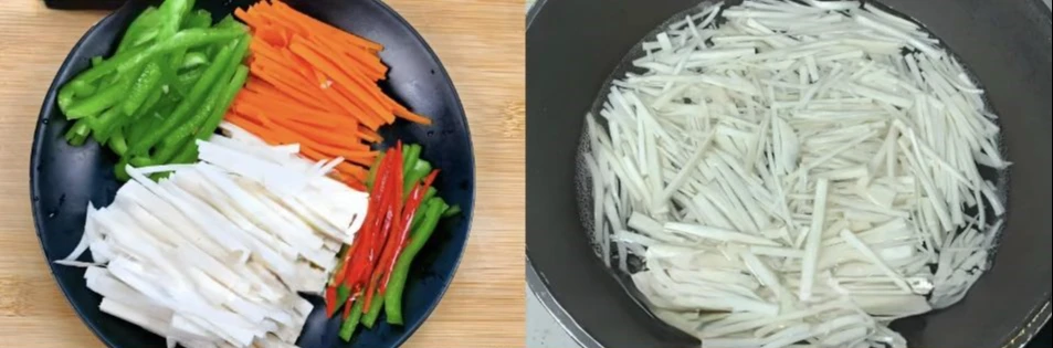 Bước 2: Tiếp theo, sẽ đến thao tác sơ chế nấm đùi gà. Rất đơn giản, hãy rửa sạch rồi cắt chúng thành các lát dày, sau đó thái thành dạng sợi. Sau đó, đun sôi nước trong nồi, cho nấm đùi gà đã cắt sợi vào chần trong 5 phút. Sau khi chần, rửa lại bằng nước sôi để nguội, rồi vắt bớt nước thừa và để sang một bên.