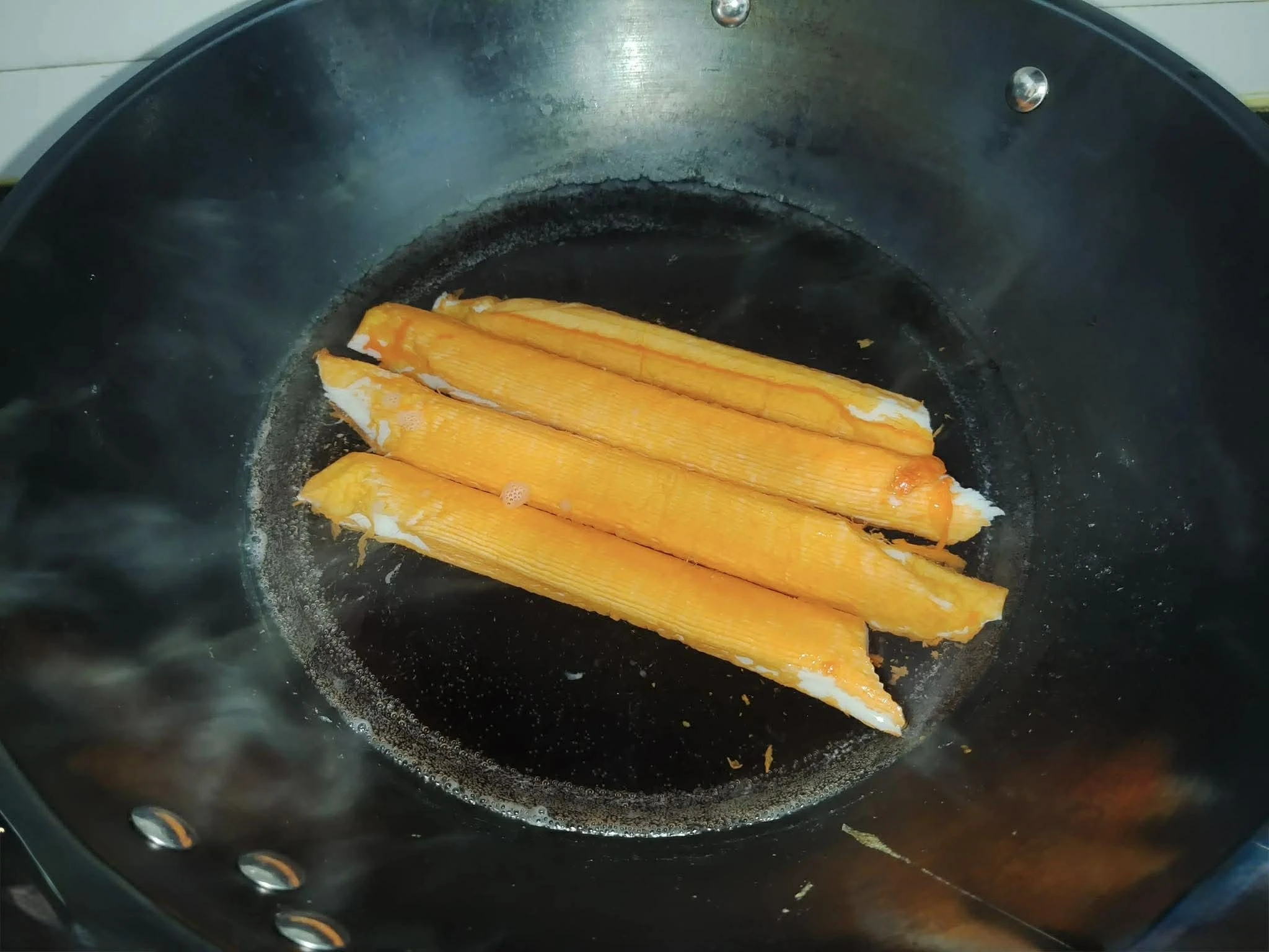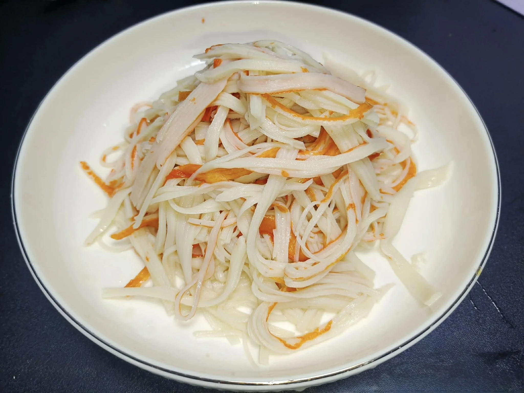 Bước 1: Để làm món ăn này, bạn hãy chọn những thanh cua to một chút. Sau khi rã đông, thả chúng vào nồi nước sôi rồi chần trong khoảng 1 phút. Tiếp theo, vớt thanh cua ra, để nguội một chút rồi nhẹ nhàng bóp bằng tay để chúng tách thành từng miếng dạng sợi. Sau khi sơ chế xong thanh cua thì cho vào đĩa, để dùng sau.