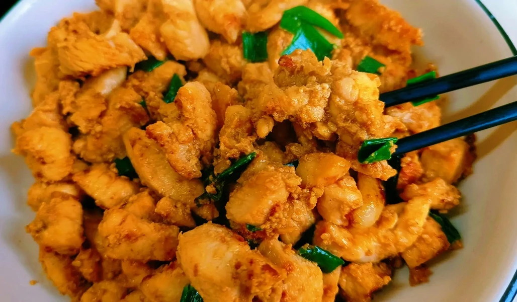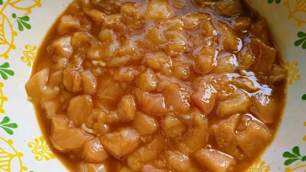 Để thịt gà mềm và không bị dai sau khi nấu, cần phải làm mềm thịt trước khi chiên. Phương pháp cụ thể là dùng dao dần miếng thịt sau đó thái khối rồi ướp thịt gà với tinh bột và lòng trắng trứng.