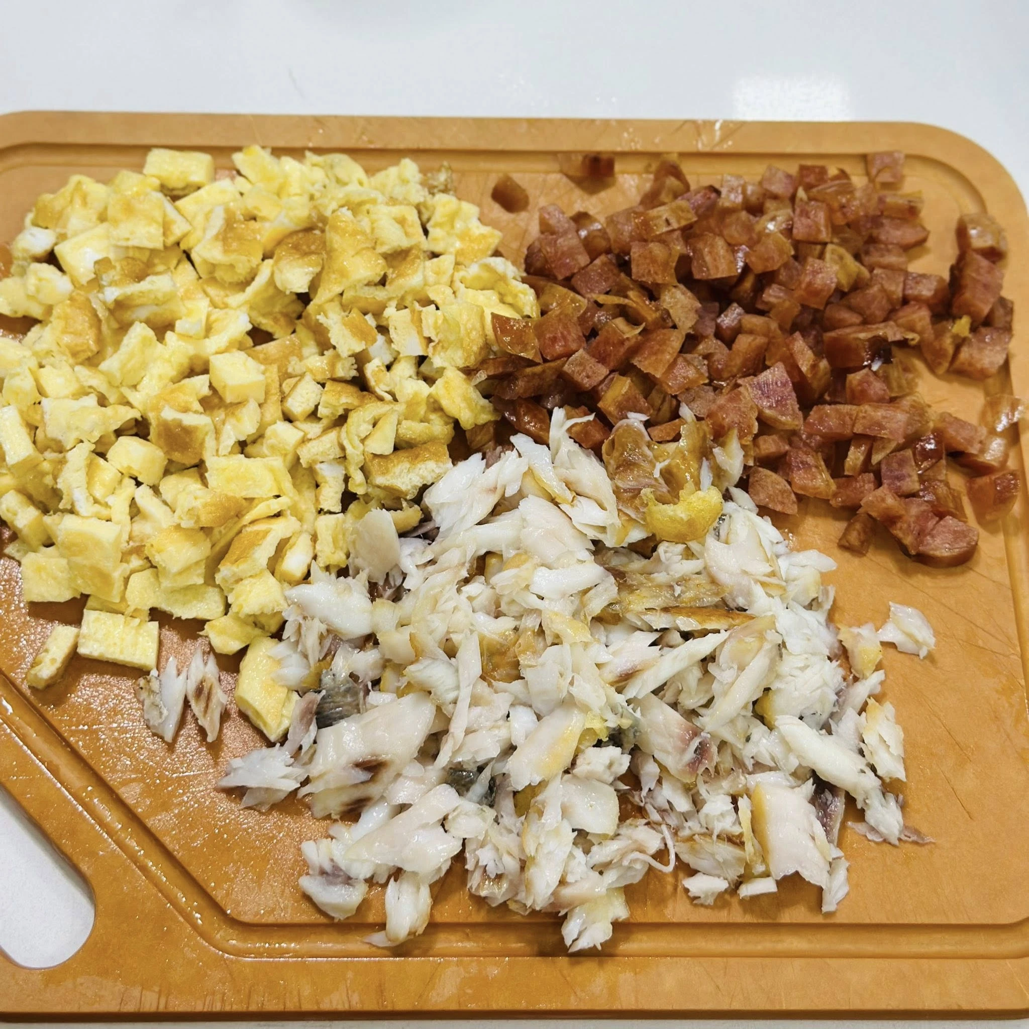 Lạp xưởng cắt lát mỏng, chiên vàng, sau đó thái hạt lựu. Cá khô một nắng chiên vàng thơm, xé nhỏ, bỏ xương. Ảnh: Thanh Huệ