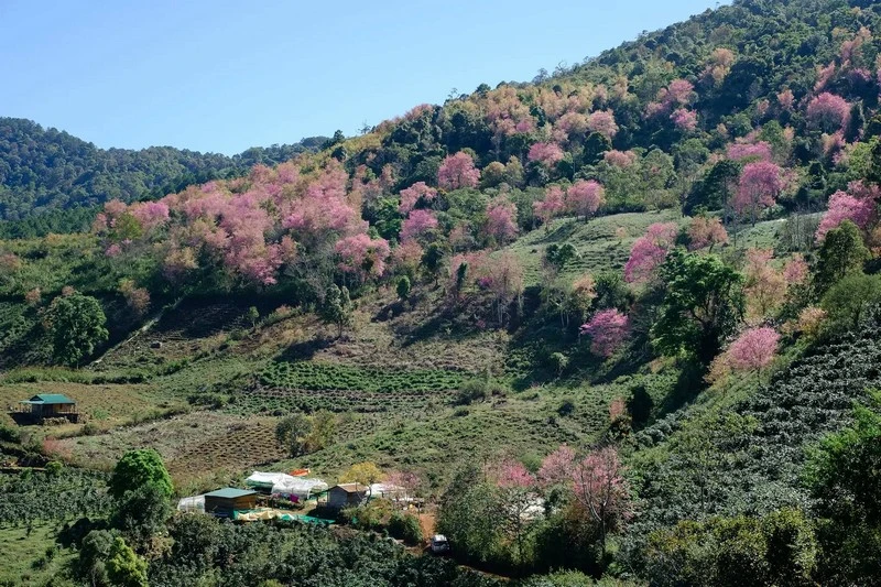 Nhiều gốc mai anh đào cổ thụ trong khu vực đang bung nở đồng loạt, sắc hồng trải dài theo triền núi, xen giữa những rừng thông xanh thẳm và làn sương mỏng buổi sớm. Ảnh: Mây Trắng