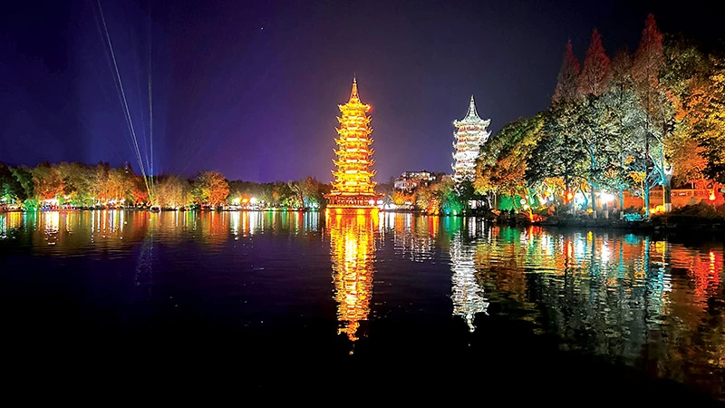Giữa hai tháp là cây cầu cong cong, ban đêm trông như một dải lụa sáng bắc ngang mặt hồ. Du khách tản bộ chậm rãi, tiếng nước khẽ lay động, tiếng gió lướt qua hàng liễu rủ hòa vào ánh sáng phản chiếu, tạo nên một Quế Lâm rất khác: không núi non hùng vĩ, không sông nước cuồn cuộn, mà dịu dàng, thơ mộng hơn ban ngày. Và đầy chất trữ tình.