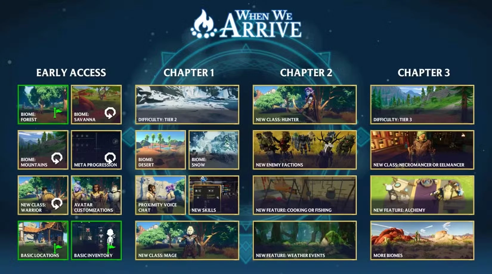 Không chỉ dừng lại ở bản thử nghiệm ngắn ngủi, When We Arrive còn công bố lộ trình phát triển khá chi tiết. Giai đoạn Early Access dự kiến sẽ bao gồm nhiều quần xã sinh vật (biomes), hệ thống kỹ năng và các tính năng cốt lõi. Đáng chú ý, đội ngũ phát triển đặt mục tiêu phát hành phiên bản hoàn chỉnh chỉ khoảng sáu tháng sau khi Early Access khởi động – một khoảng thời gian tương đối ngắn so với mặt bằng chung.