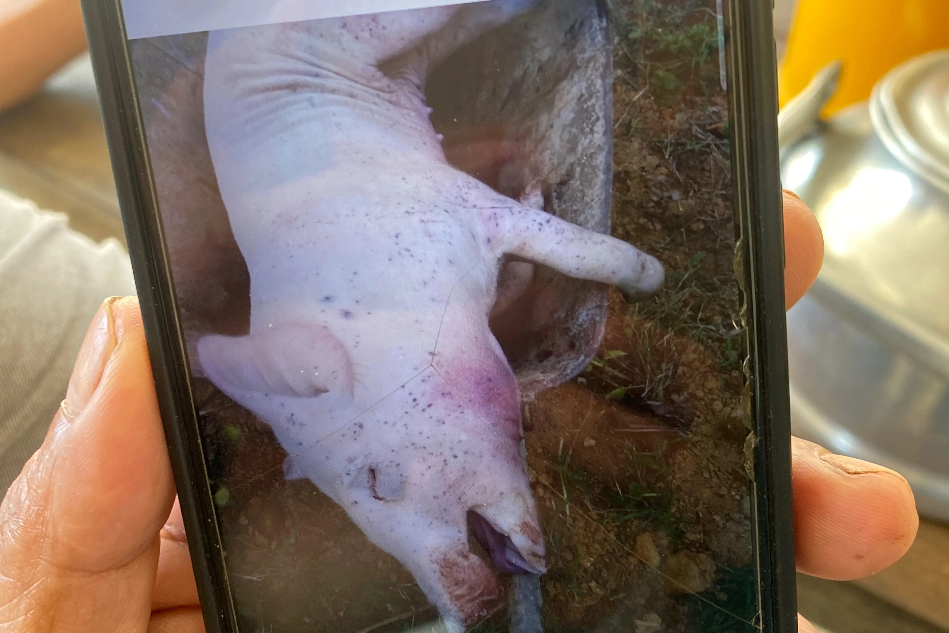 Một con lợn bị chết và được gia đình ông Cao Viết Hùng đem đi tiêu hủy (Ảnh: Chụp lại màn hình điện thoại chủ nhà).