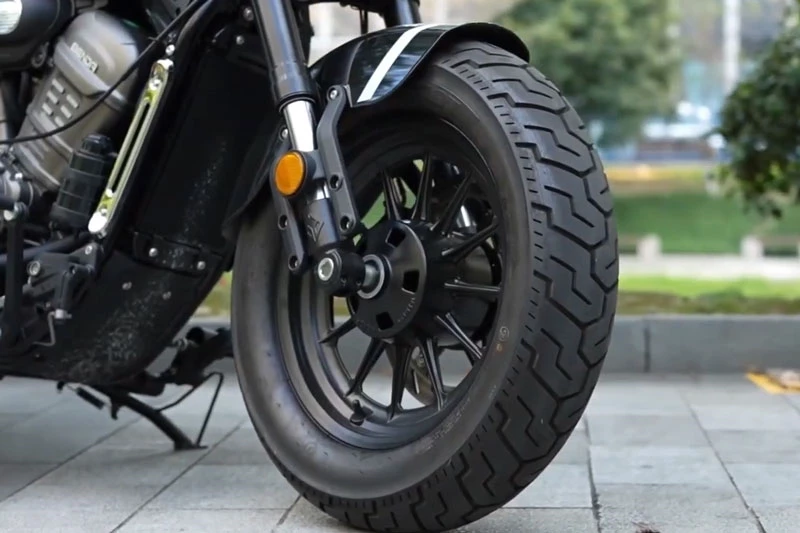 Tư thế tổng thể của xe được xác định bởi yên thấp 690 mm và cặp mâm đúc 16 inch đi kèm lốp bản lớn (130/80 trước, 150/80 sau). Tỉ lệ này mang lại dáng đứng "trườn" xuống mặt đường đúng chất bobber, đồng thời tăng cảm giác bám vững khi dừng chờ hoặc xoay trở trong phố. Với trọng lượng 171 kg, Rebel 300 2026 vẫn nằm trong ngưỡng dễ làm chủ cho người mới bắt đầu ở phân khúc này.