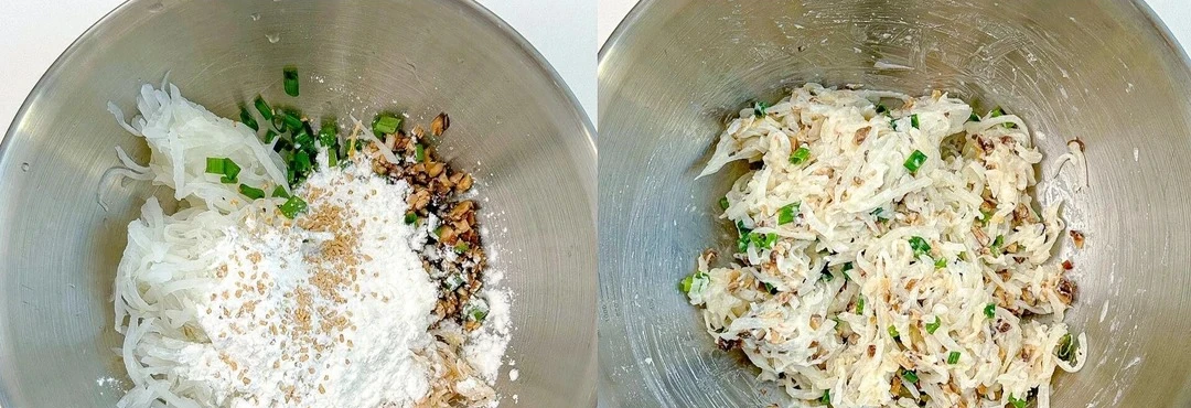 Cho củ cải bào đã chần, nấm hương thái nhỏ, tôm khô đã ngâm mềm, hành lá cắt khúc vào một âu lớn. Rắc 15g bột ngô 15g bột mì lên trên, thêm vào một ít bột nêm nấm, một nhúm muối nhỏ, ít tiêu. Dùng tay hoặc đũa trộn đều, bóp nhẹ để các nguyên liệu quyện lại với nhau. Bột sẽ bám vào sợi củ cải và nhân, tạo thành hỗn hợp hơi dính, có thể nắm thành từng viên mà không bị rã.