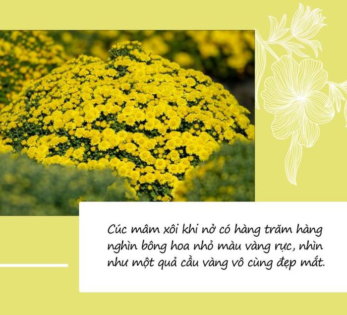 Chỉ trên một thân cây có đến hàng trăm nhánh, bên dưới là những tán lá xanh mát mắt, còn bên trên và trăm, ngàn nụ hoa thi nhau đua nở. Toàn thân cây có hình vòm và khi hoa nở rộ giống như một mâm xôi vàng óng, đầy đặn. Chính vì lẽ đó mà loài hoa này có tên gọi là hoa cúc mâm xôi.