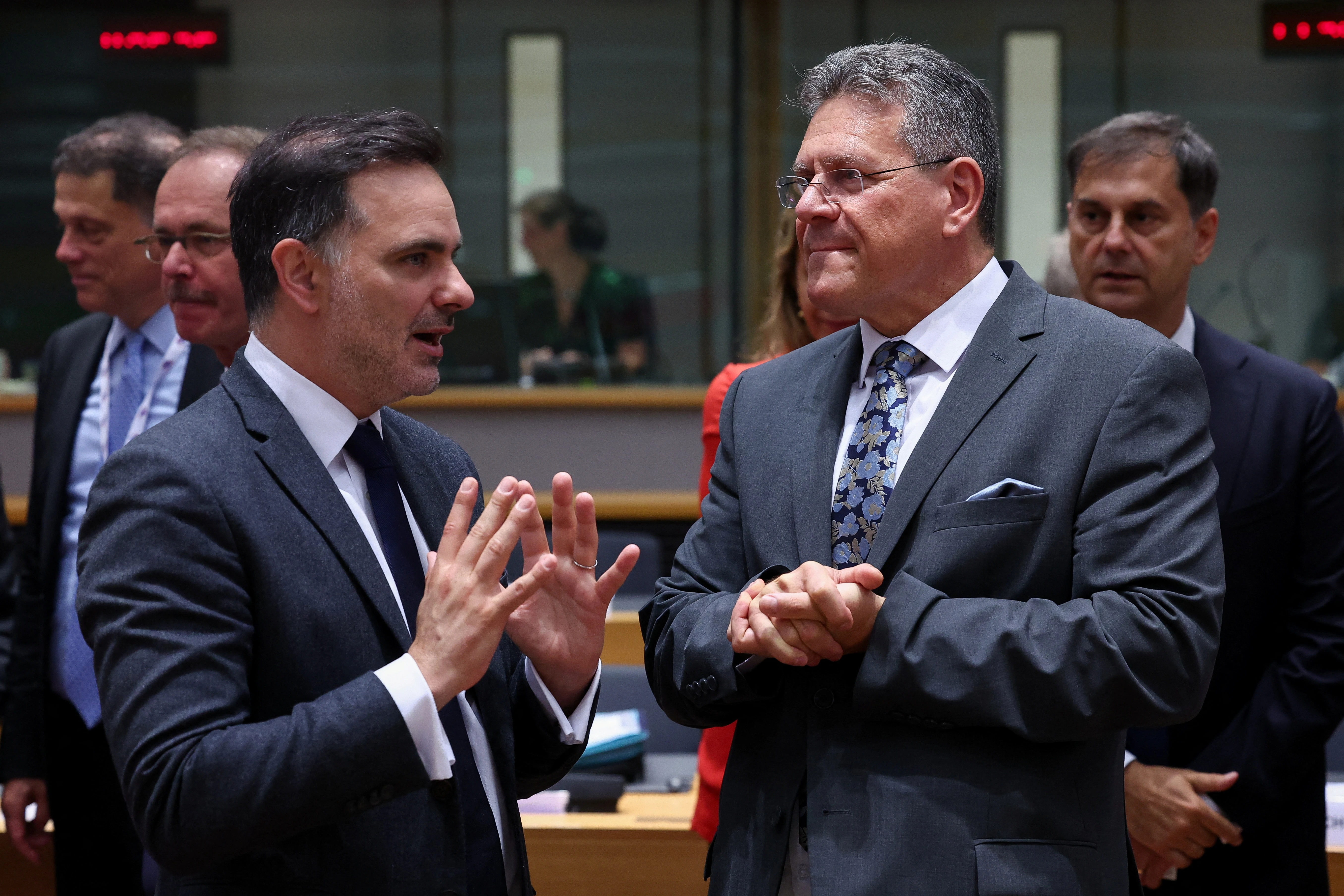 Ông Laurent Saint-Martin (trái), Bộ trưởng ủy quyền đặc trách Ngoại thương và người Pháp tại nước ngoài, và Ủy viên Thương mại EU Maros Sefcovic tham dự cuộc họp về vấn đề thuế quan với Mỹ tại Brussels, Bỉ ngày 14/7 (Ảnh: Reuters).