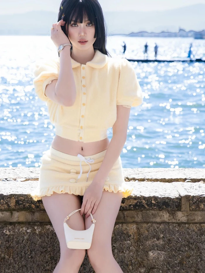 Ngọc Trinh diện trang phục tông màu vàng nhạt, gồm áo ngắn tay và chân váy đồng bộ. Kiểu dáng đơn giản nhưng giúp tôn lên vóc dáng, đồng thời phù hợp với khung cảnh thiên nhiên xung quanh. Bên cạnh trang phục, lối trang điểm trong veo, nhẹ nhàng đã giúp cô giữ được vẻ tươi tắn, rạng rỡ giữa khung cảnh thơ mộng.