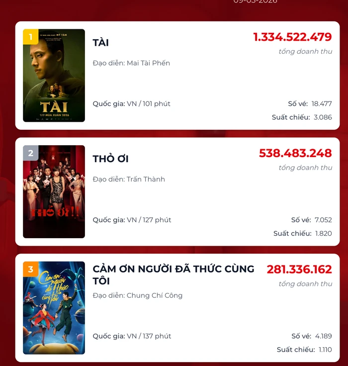 Trên thực tế, sức hút của bộ phim đang phần nào được phản ánh qua thành tích phòng vé. Hiện, phim Tài đang dẫn đầu bảng xếp hạng doanh thu tại rạp, cho thấy mức độ phủ sóng đáng kể cũng như sự quan tâm lớn của khán giả dành cho dự án lần này.