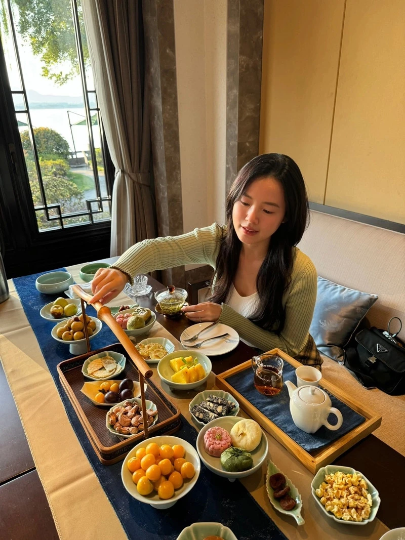 Diễn viên Midu thảnh thơi thưởng thức trà chiều trong không gian yên bình dịp cuối tuần.