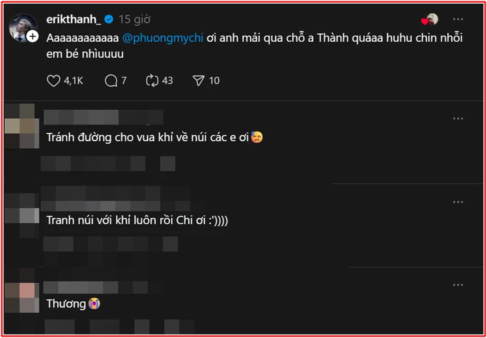 Theo đó, nam ca sĩ gắn thẻ tài khoản của Phương Mỹ Chi, viết: “Phương Mỹ Chi ơi, anh mải qua chỗ anh Thành quá huhu, xin lỗi em bé nhiều”. Lời xin lỗi dí dỏm, chân thành của ERIK lập tức khiến khán giả thích thú. Nhiều ý kiến dành lời khen ngợi ERIK vì biết cách xử lý sự cố theo hướng tích cực.
