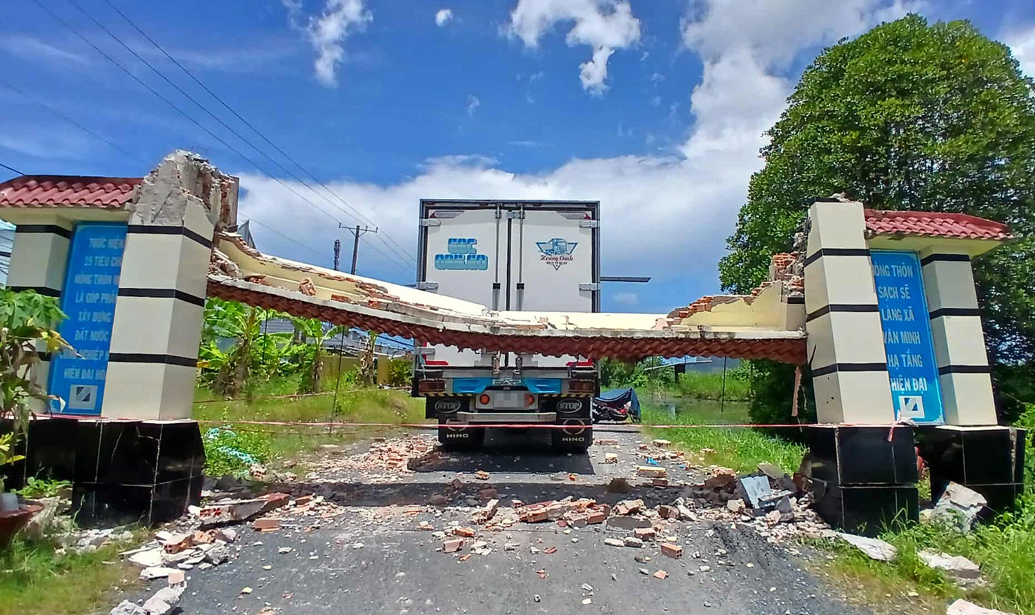 Cổng chào cao hơn 3m, ngang 4m bị xe tải tông sập. Ảnh: T.H