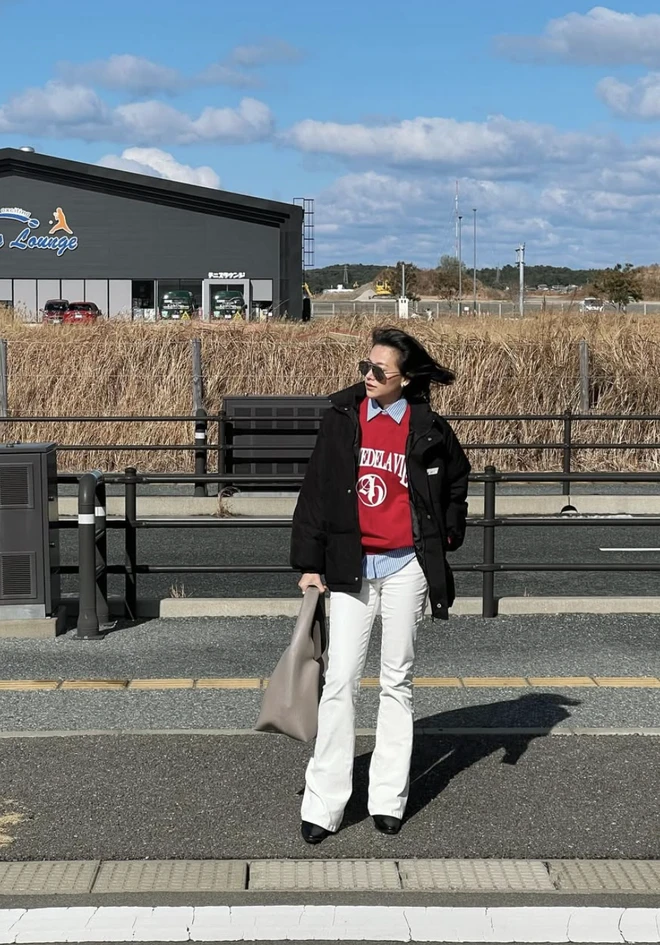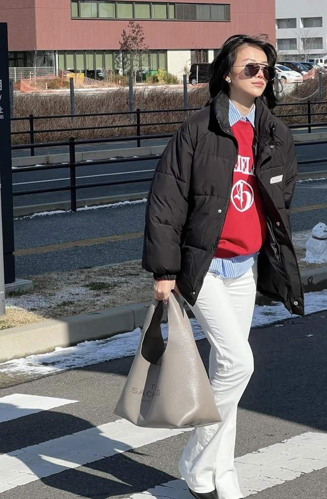 Chiếc áo phao đen dáng ngắn với độ phồng vừa phải mang lại cảm giác ấm áp và gọn gàng, đồng thời nổi bật hơn khi đi cùng áo sơ mi kẻ, áo nỉ đỏ và quần ống rộng trắng . Sự kết hợp giữa màu sắc tương phản và kỹ thuật layering giúp bản phối đậm chất phong cách đường phố mà vẫn tinh tế. Thêm chiếc túi tote xám và kính râm, nàng hoàn thiện vẻ ngoài hiện đại, cho thấy vì sao áo khoác phao luôn là lựa chọn khó thay thế mỗi mùa lạnh.