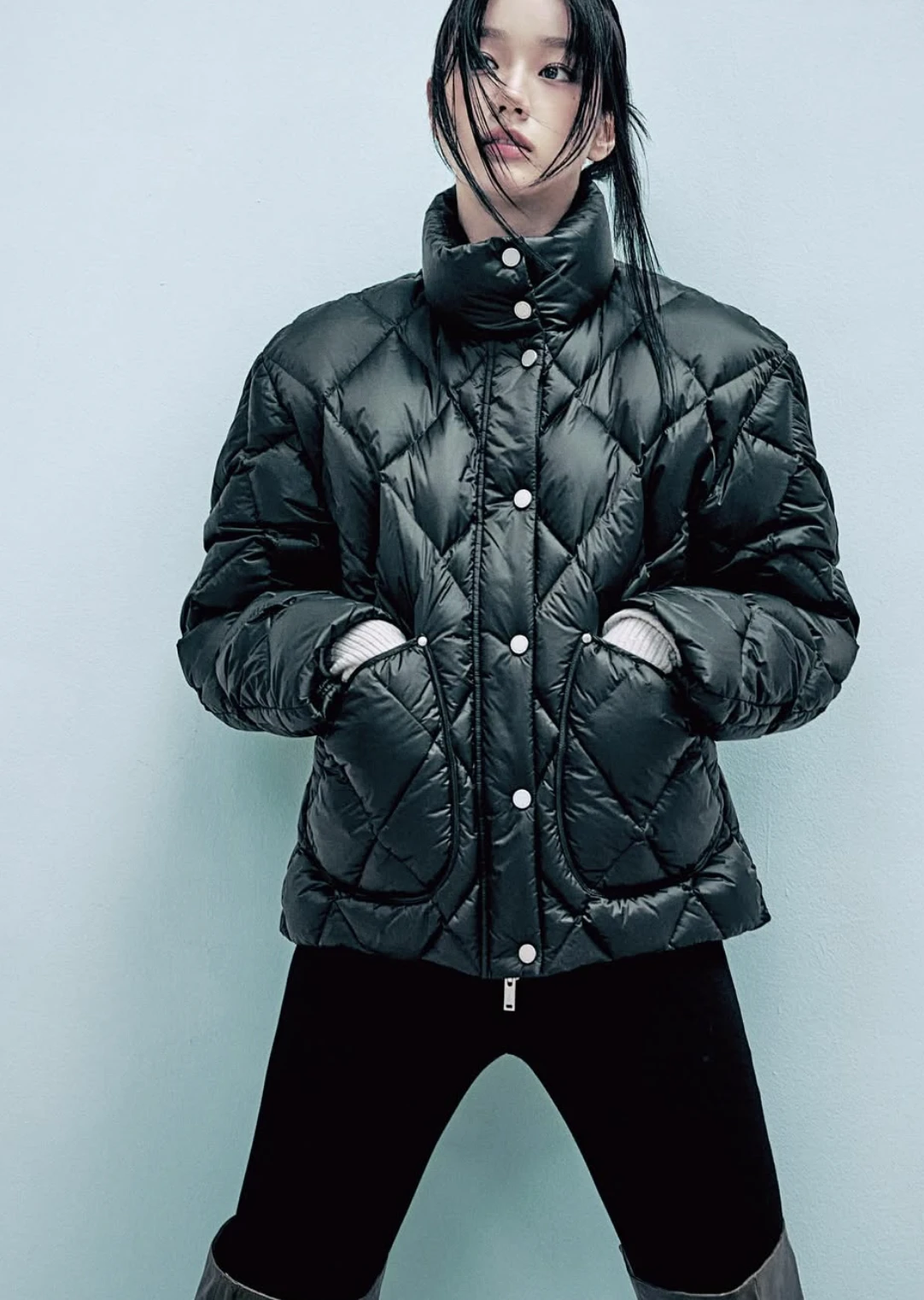 Gam màu tối trung tính giúp diện mạo gọn gàng hơn, trong khi phom crop top tạo hiệu ứng đôi chân dài đầy ưa nhìn. Họa tiết chần bông hình quả trám kết hợp cùng hàng nút trắng tương phản mang đến nét tinh tế và cá tính vừa đủ. Khi phối cùng legging hoặc skinny jeans và bốt cao cổ, chiếc áo phao lập tức trở thành tâm điểm của set đồ, giúp nàng vừa ấm áp vừa toát lên phong cách đường phố tự tin giữa những ngày đông.