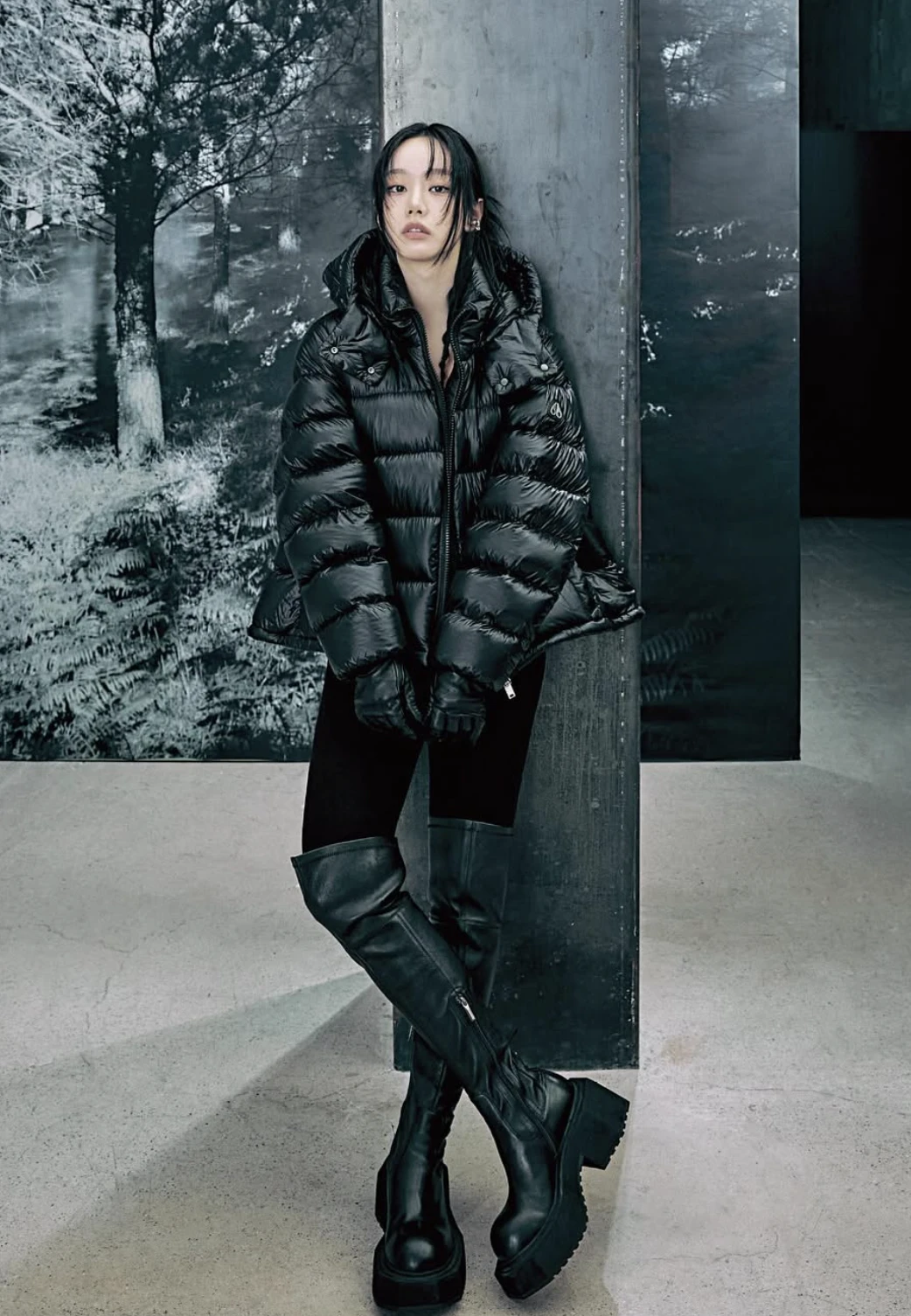 Chiếc logo nhỏ ở ngực trái tạo điểm nhấn tinh tế, giúp áo không bị đơn điệu. Khi nàng layering cùng áo đen ôm sát và găng tay dài cùng tông, trang phục lập tức có chiều sâu hơn nhờ sự hòa quyện chất liệu. Việc giữ phần dưới tối màu tạo sự cân bằng với độ phồng của áo, mang đến phong cách urban chic hiện đại và rất cuốn hút trong những ngày lạnh.