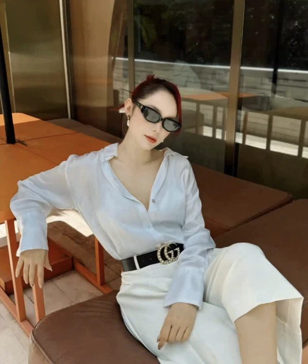Áo sơ mi trắng kết hợp cùng quần denim xám mang đến vẻ đẹp cân bằng giữa hiện đại và thanh lịch. Diễn viên Lương Thanh chọn phối cùng túi cầm tay đen, giày cao gót da và kính mắt bản lớn, tạo nên tổng thể nhẹ nhàng nhưng vẫn đủ sức cuốn hút.