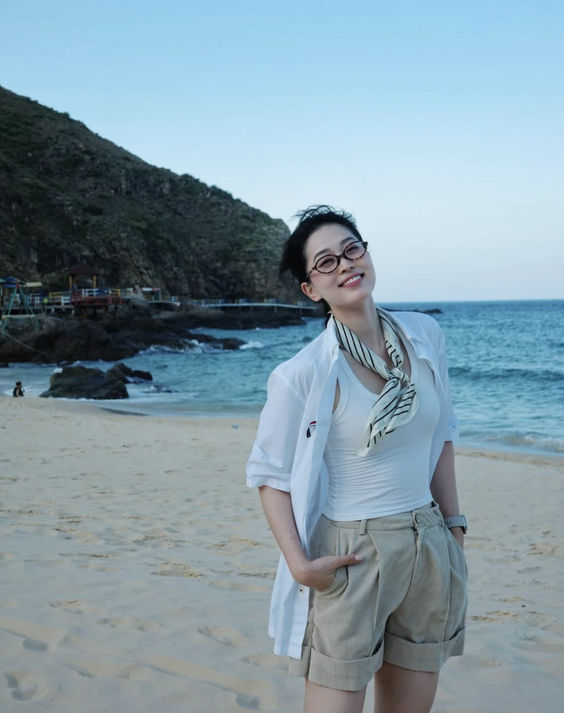 Không chỉ dạo phố hay hẹn hò, nàng còn có thể diện áo sơ mi trắng cộc tay khoác ngoài set đồ tank top và quần shorts khi đi du lịch biển . ẢNH: @PHUONGNGABUI_