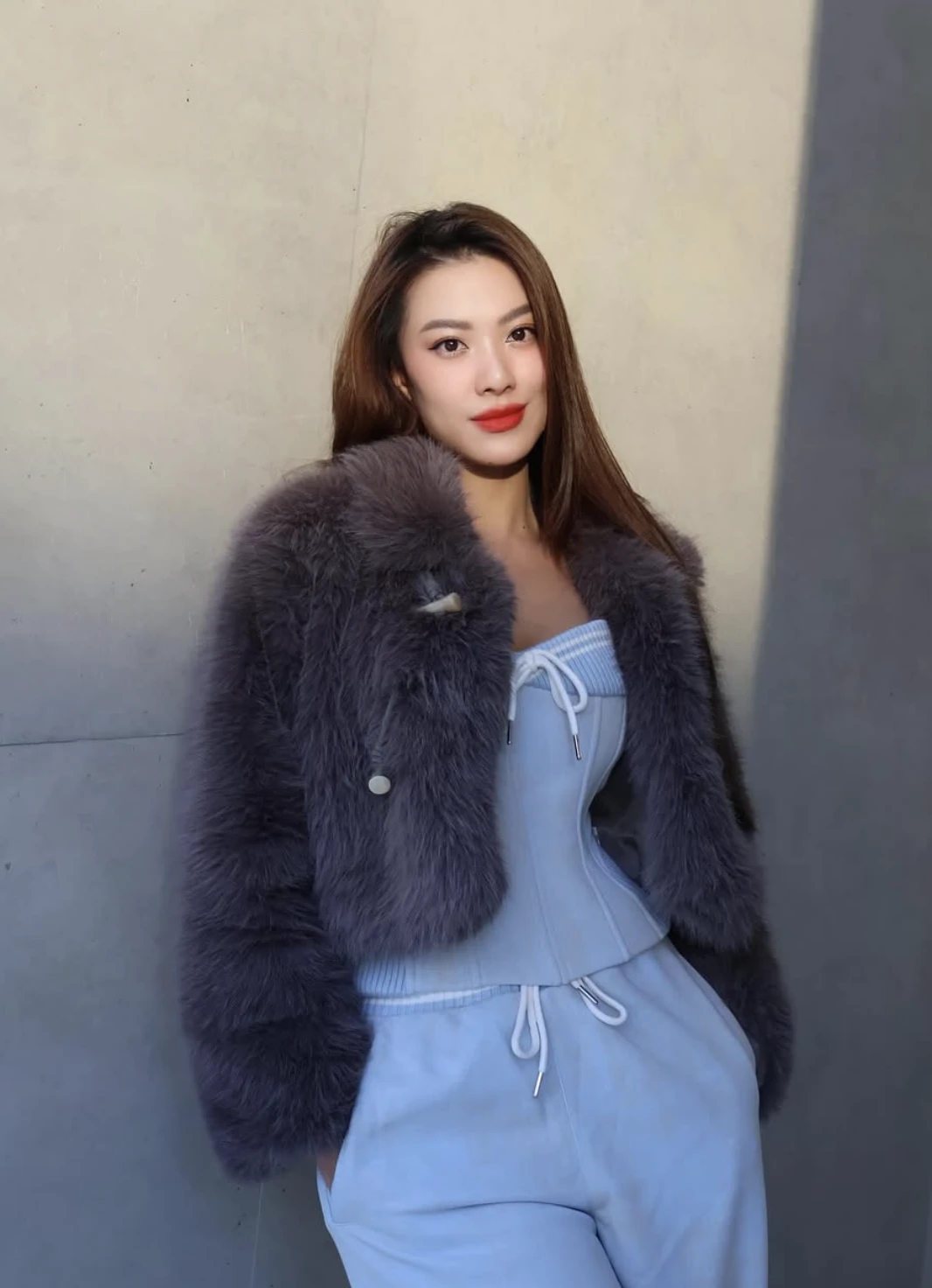 Nàng tạo dấu ấn ngay khi chọn áo khoác lông màu lông chồn nhạt làm điểm nhấn cho set đồ. Bề mặt lông xù mềm cùng hiệu ứng bồng nhẹ giúp nổi bật với chất liệu sang trọng và phom dáng cropped trẻ trung, tay bồng cân đối khi phối cùng chân váy dài