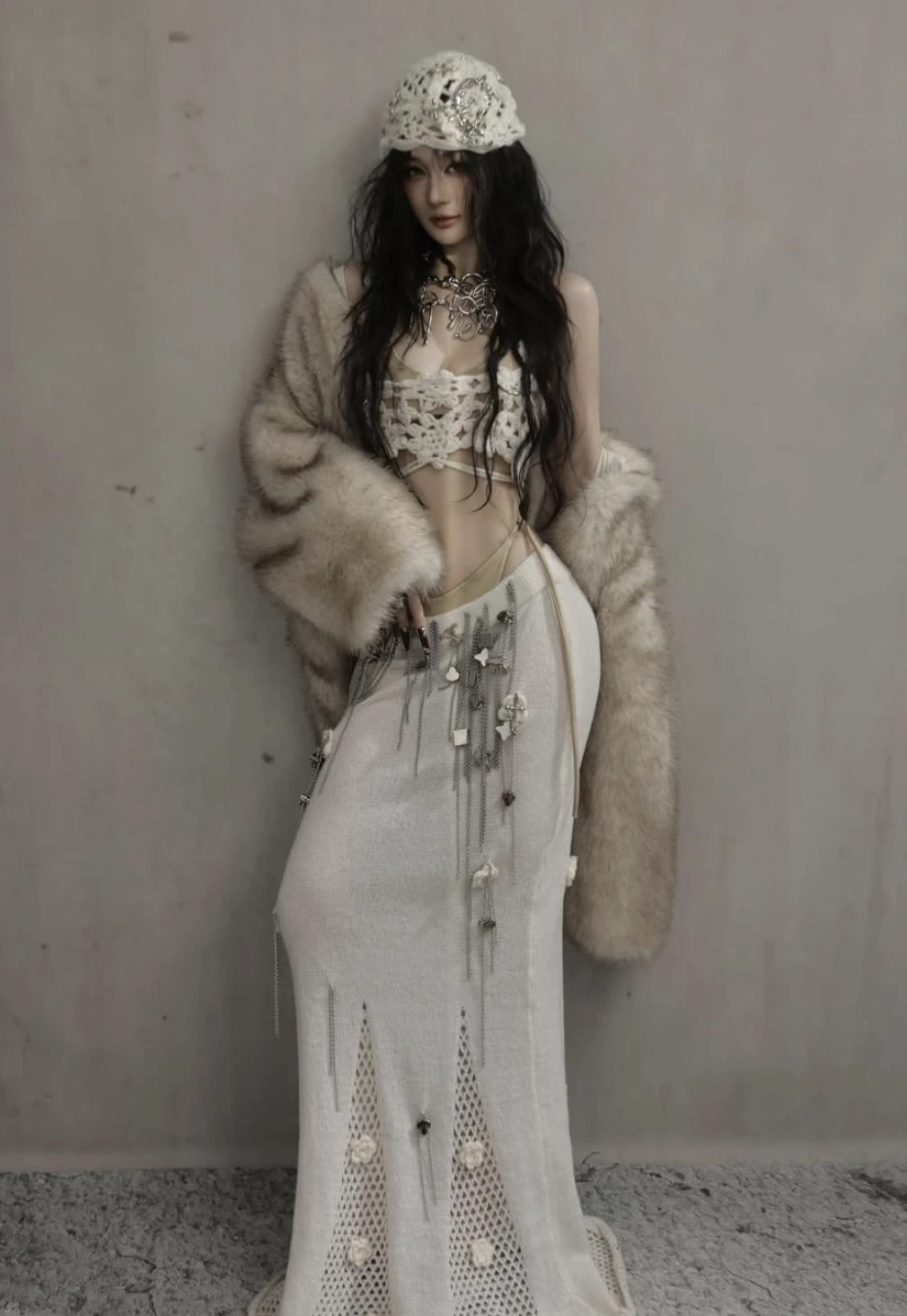 Kết hợp với bra ren trắng và váy maxi dệt kim màu kem, chiếc áo khoác lông trở thành lớp hoàn thiện tăng chiều sâu, hài hòa sự mềm mại của ren và dệt kim với nét xa xỉ vốn có. Tổng thể mang tinh thần giao thoa giữa Y2K hiện đại và bohemian phóng khoáng, thể hiện qua phụ kiện như mũ len và vòng cổ kim loại. Đây cũng là xu hướng được ưa chuộng bởi khả năng tạo khác biệt mà vẫn giữ nét nữ tính, giúp nàng nổi bật trong những ngày lạnh.