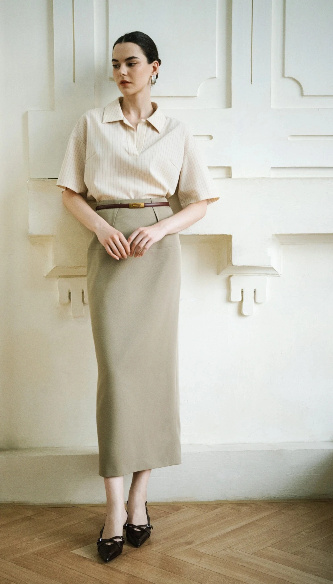 Set tone sur tone gồm áo be nhạt kẻ sọc chìm tinh tế kết hợp chân váy be trầm, điểm xuyết thắt lưng nâu đỏ, tạo tổng thể hài hòa với sắc độ đồng điệu