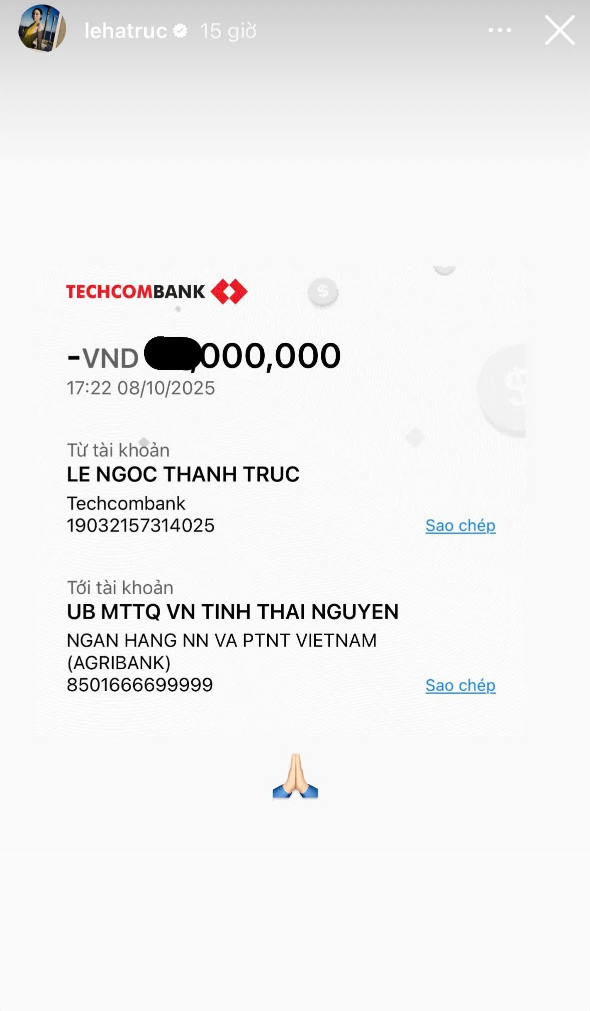 Sau khi đăng tải những story đầu tiên trên trang cá nhân Instagram, đánh dấu sự trở lại, Lê Hà Trúc chia sẻ ảnh chụp màn hình chuyển khoản ủng hộ đồng bào bão lũ vào ngày 8/10.
