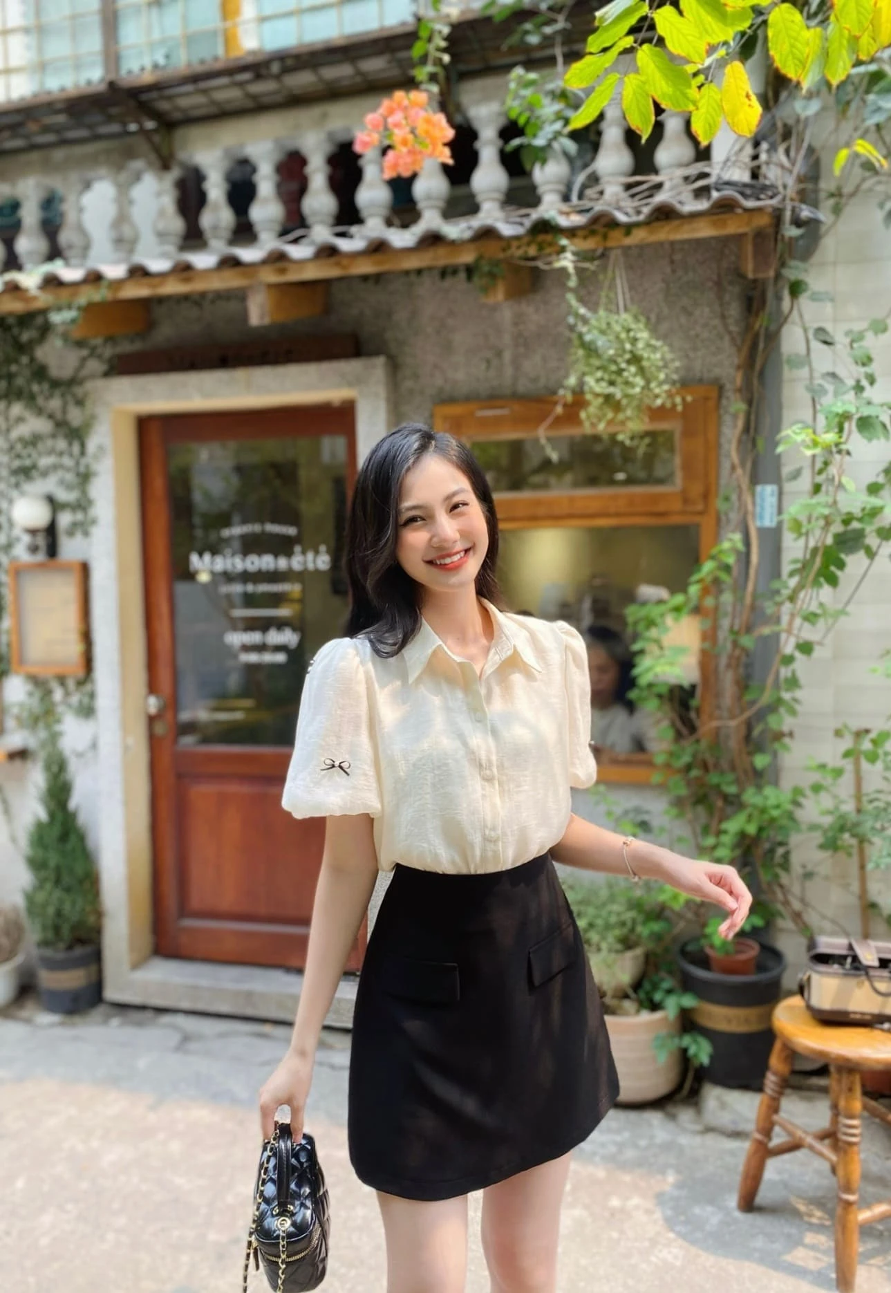 Thiết kế này gợi nhớ về hình ảnh quý cô thanh lịch của thập niên trước, nay được biến tấu để phù hợp với nhịp sống hiện đại. Áo sơ mi trắng kem chất liệu đũi, nhấn nhá bằng cổ sen bèo nhún và tay áo bồng kết hợp này với chân váy chữ A cùng tông màu tạo nên tổng thể hài hòa.