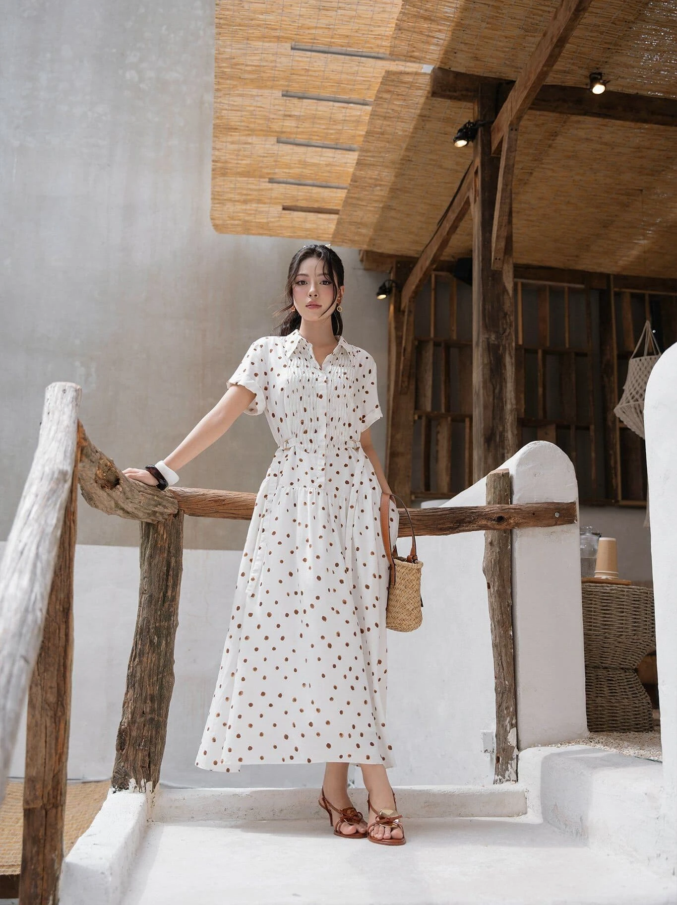 Đầm sơ mi trắng với họa tiết chấm bi nhỏ xinh gợi vẻ đẹp vừa cổ điển vừa lãng mạn. Dáng suông dài với eo bo chun tinh tế, tôn vòng eo thon, thêm đôi xăng đan quai mảnh và túi cói tôn vẻ mong manh của người mặc.