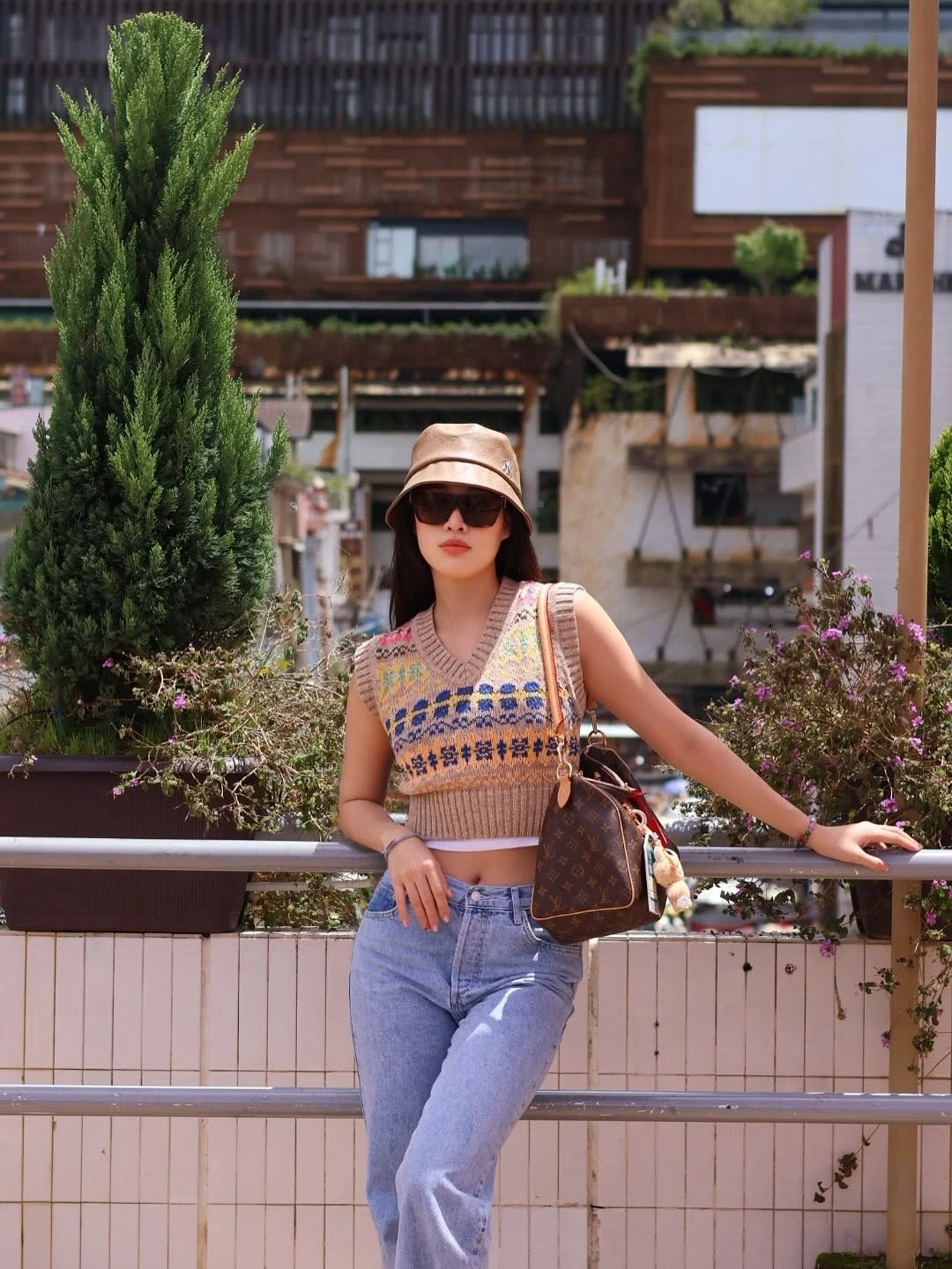 Những cô nàng yêu vẻ đẹp thanh lịch, không thể nào bỏ qua chiếc áo len gile dáng crop top. Khánh Vân diện lên mình chiếc áo len gile thổ cẩm dáng crop top tôn lên vòng eo con kiến. Nàng hậu phối cùng quần denim xanh và chiếc mũ da ôm vừa đầu, toát lên khí chất vừa thanh lịch vừa thời trang.
