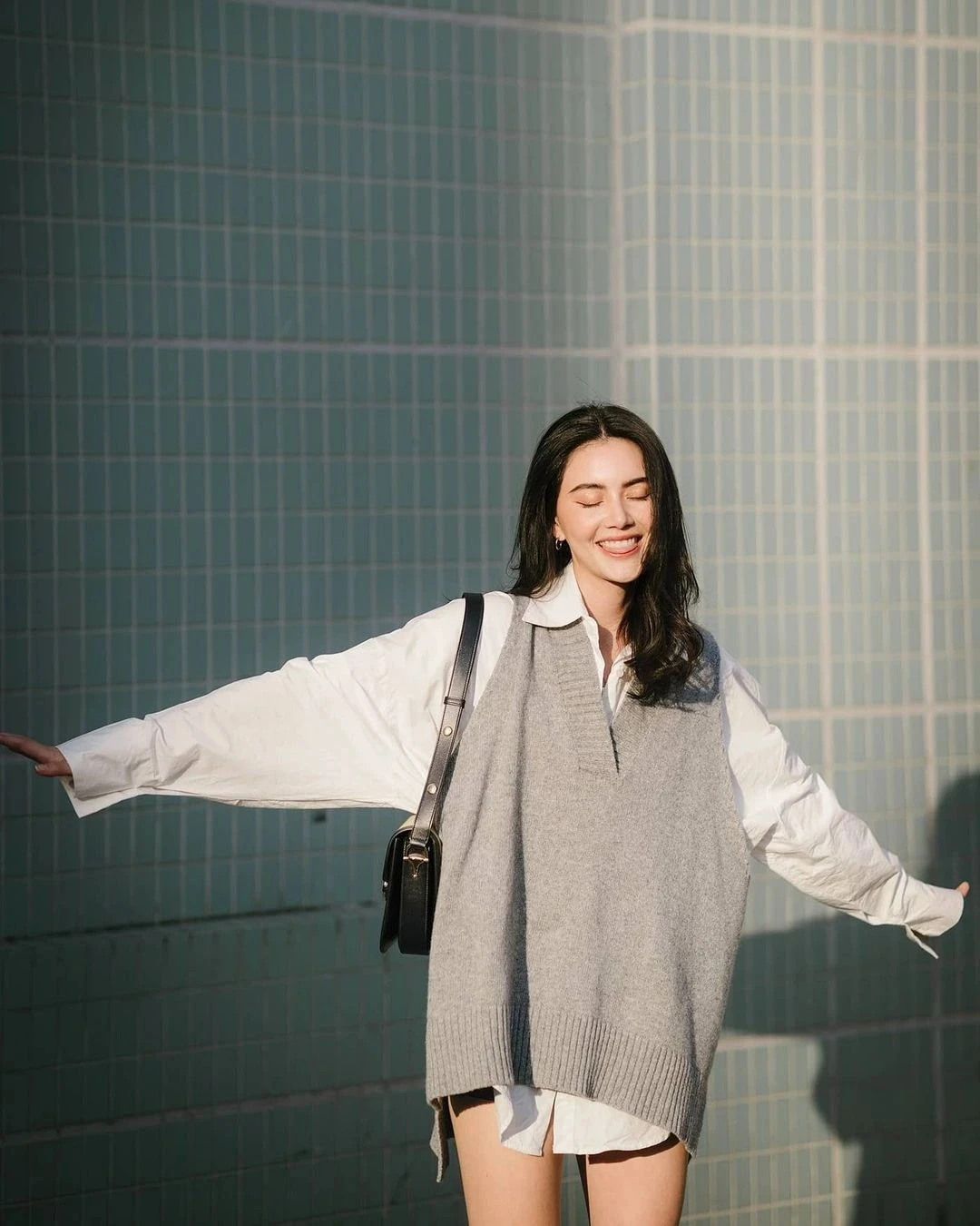 Mai Davika lựa chọn diện áo len gile trơn dáng rộng cổ chữ V thời thượng. Nữ diễn viên phối cùng áo sơ mi trắng oversized và phong cách giấu quần giúp tôn lên đôi chân thon gọn