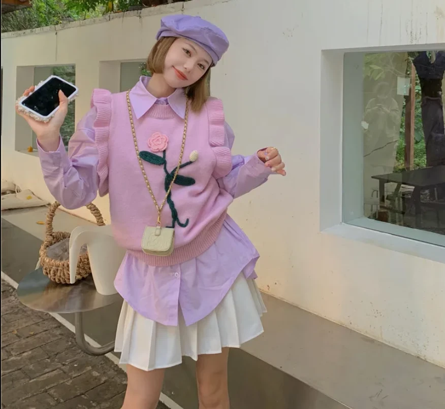 Mang hơi thở của nét đẹp ngọt ngào, các nàng có thể lựa chọn chiếc áo len gile màu hồng. Điểm nhấn của chiếc áo chính là bông hoa được thêu nổi thủ công, có thể phối cùng chiếc áo sơ mi bên trong và chân váy tennis để "ăn gian" chiều cao