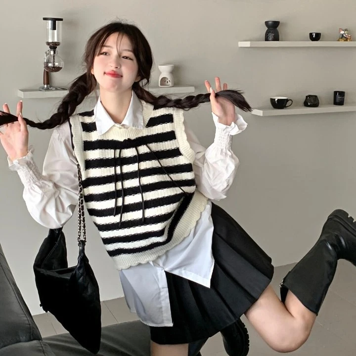 Nàng có thể lựa chọn áo len gile kẻ sọc với điểm nhấn là phần hoa bèo ở tay và đai áo. Bên trong, phối cùng áo sơ mi trắng với phần bo chun ở cổ tay đáng yêu. Chân váy tennis sẽ là lựa chọn hoàn hảo để hoàn thiện phong cách học đường ngày thu