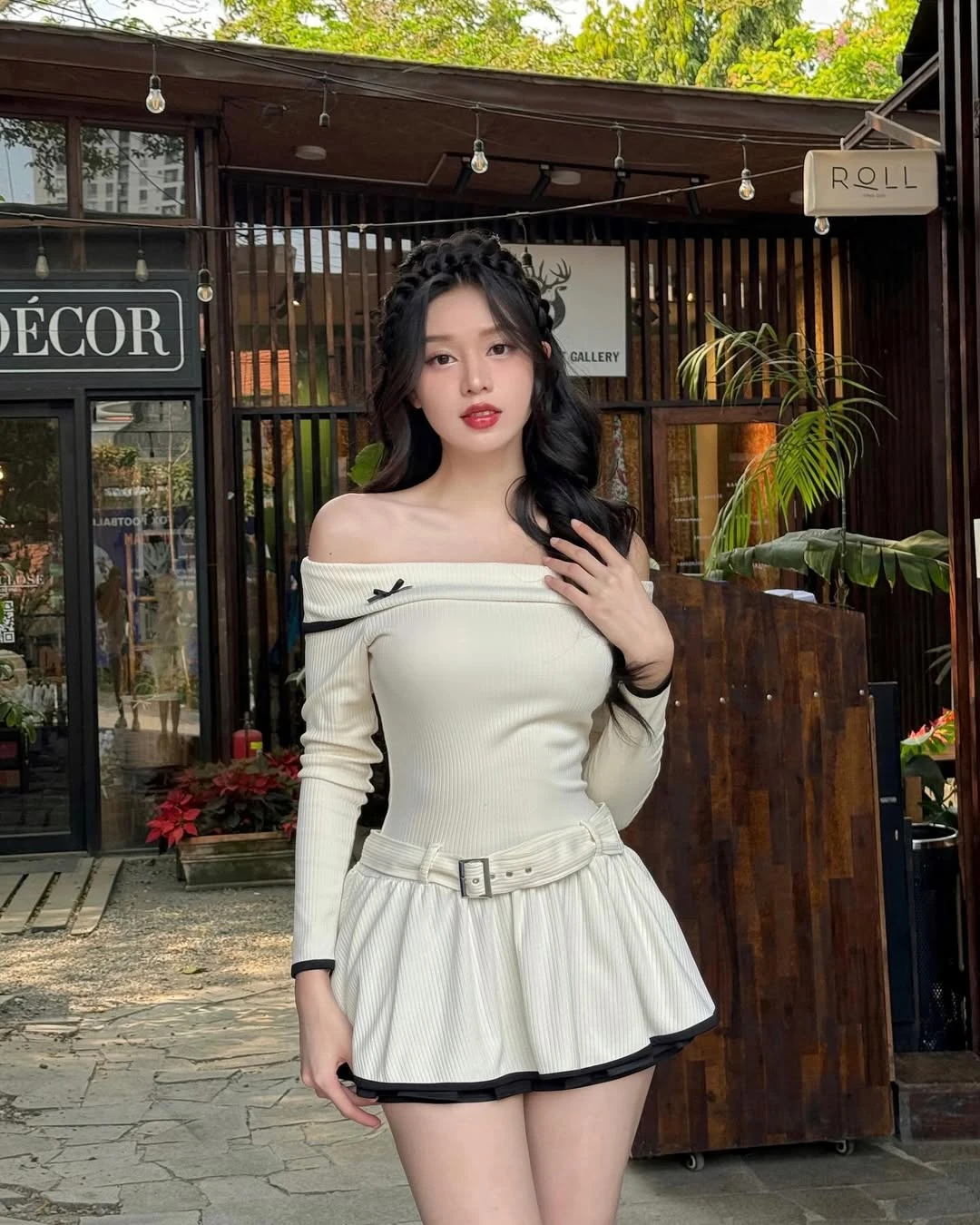 Mang nét đẹp quyến rũ, Thanh Thủy lại lựa chọn chiếc đầm chiết eo trễ vai cực tinh tế . ẢNH: @THANHTHUY.HHVN