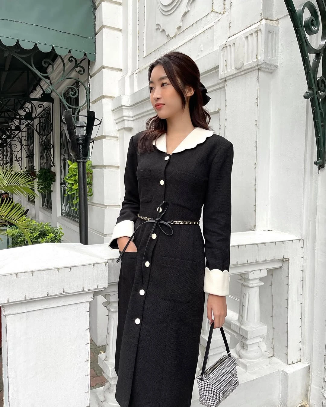 Nét thanh lịch hòa cùng vẻ cuốn hút được hé lộ qua đầm chiết eo dài tay. Hoa hậu Đỗ Mỹ Linh lựa chọn chiếc đầm với tông đen trắng làm chủ đạo khiến thần thái trở nên vô cùng cuốn hút.