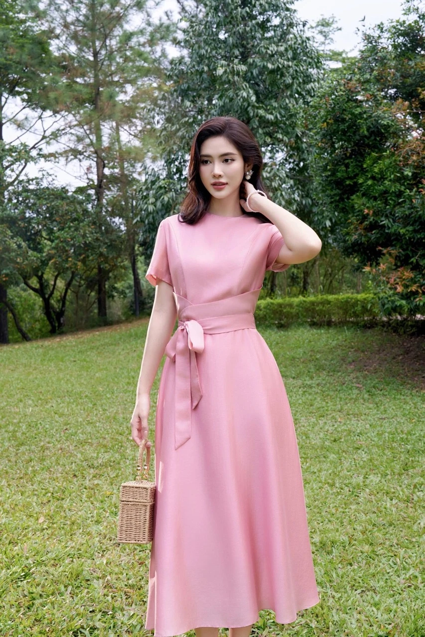 Nối tiếp nét đẹp thanh lịch đó, nàng có thể lựa chọn chiếc đầm dài tông hồng pastel cực mềm mại với điểm nhấn là phần thắt đai eo bản lớn giúp tổng thể trẻ trung và thơ mộng hơn